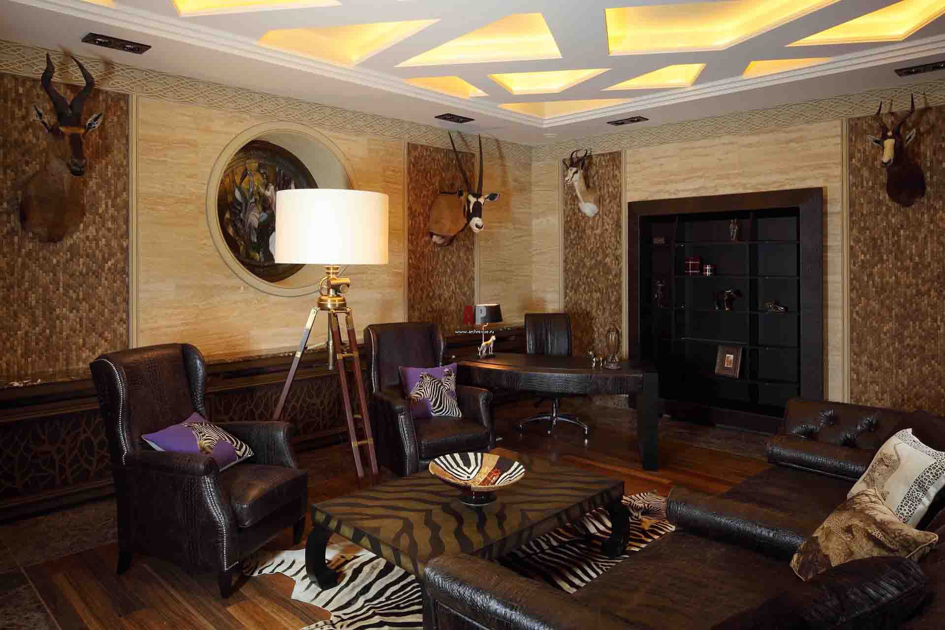 Кабинет хозяина с колониальными мотивами в духе ар-деко. На стенах – травертин и мозаика из кокоса. Круглое окно украшает авторский витраж. Изготовление, «Мастерская Александра Феряева».