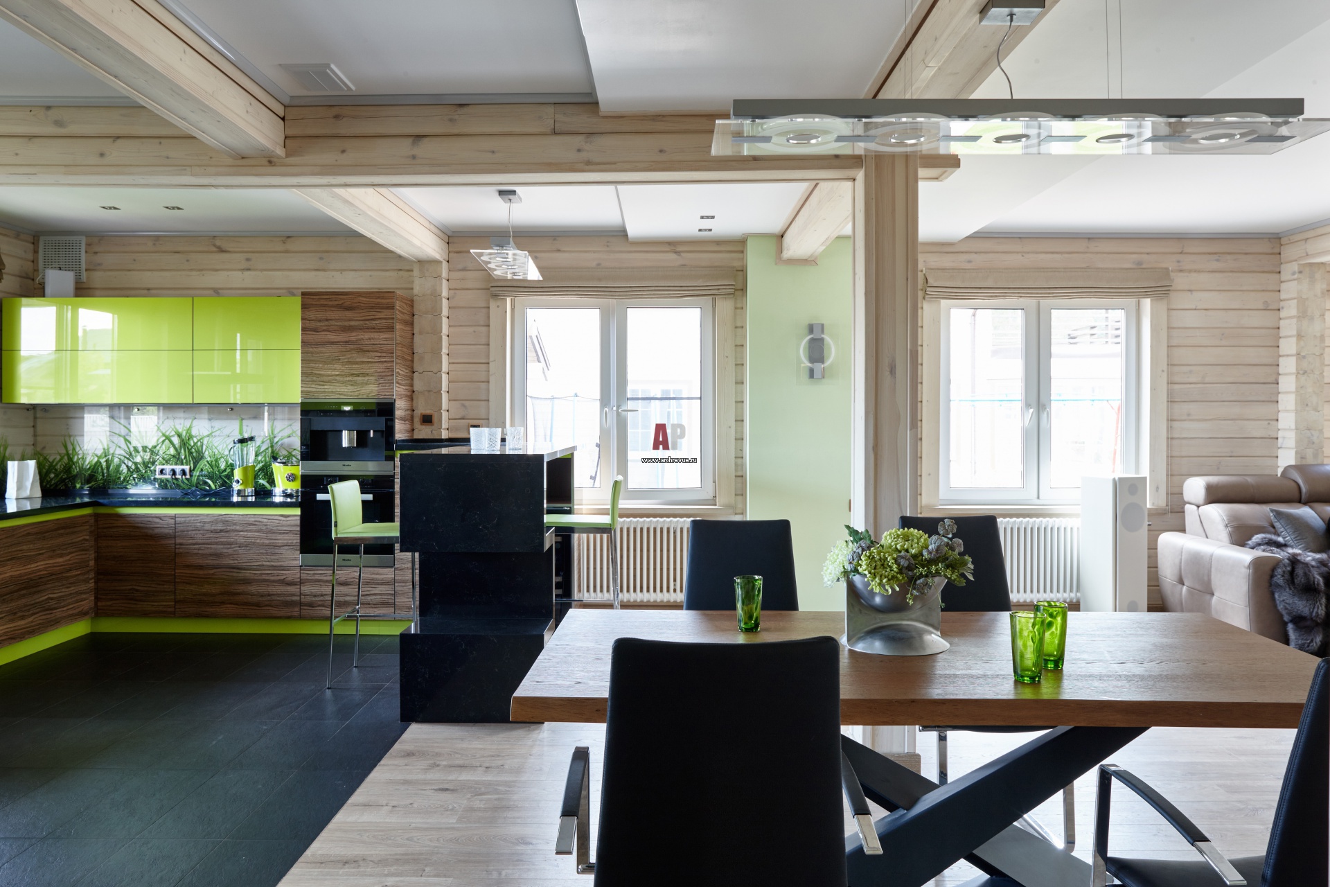 На фоне светлых стен активным пятном выглядит кухня сочного салатового цвета в сочетании с зебрано. Она выполнена на заказ по эскизам архитектора.