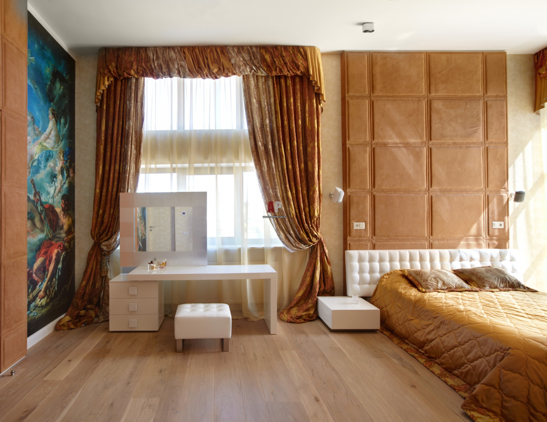Интерьер спальни с туалетным столиком. Белый минималистичный гарнитур Besana контрастирует с оформлением стены репродукцией полотна Француа Буше, выполненной на холсте. Справа также находится выход гардеробную, распашные двустворчатые двери зашиты замшей.