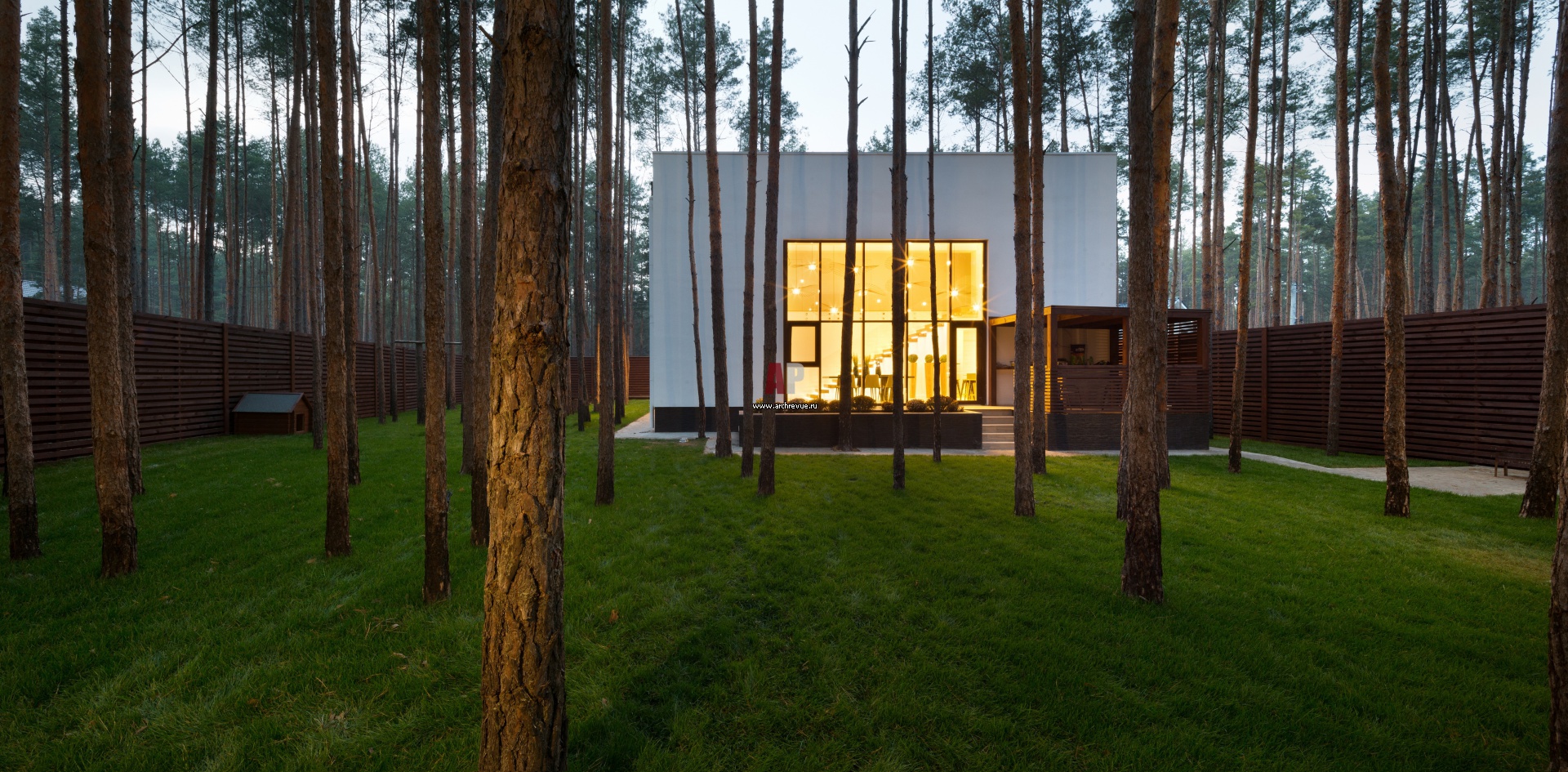 Дом-куб в стиле минимализм построен на участке площадью 0,7 га в окружении соснового леса. Одна стена выполнена из стекла.