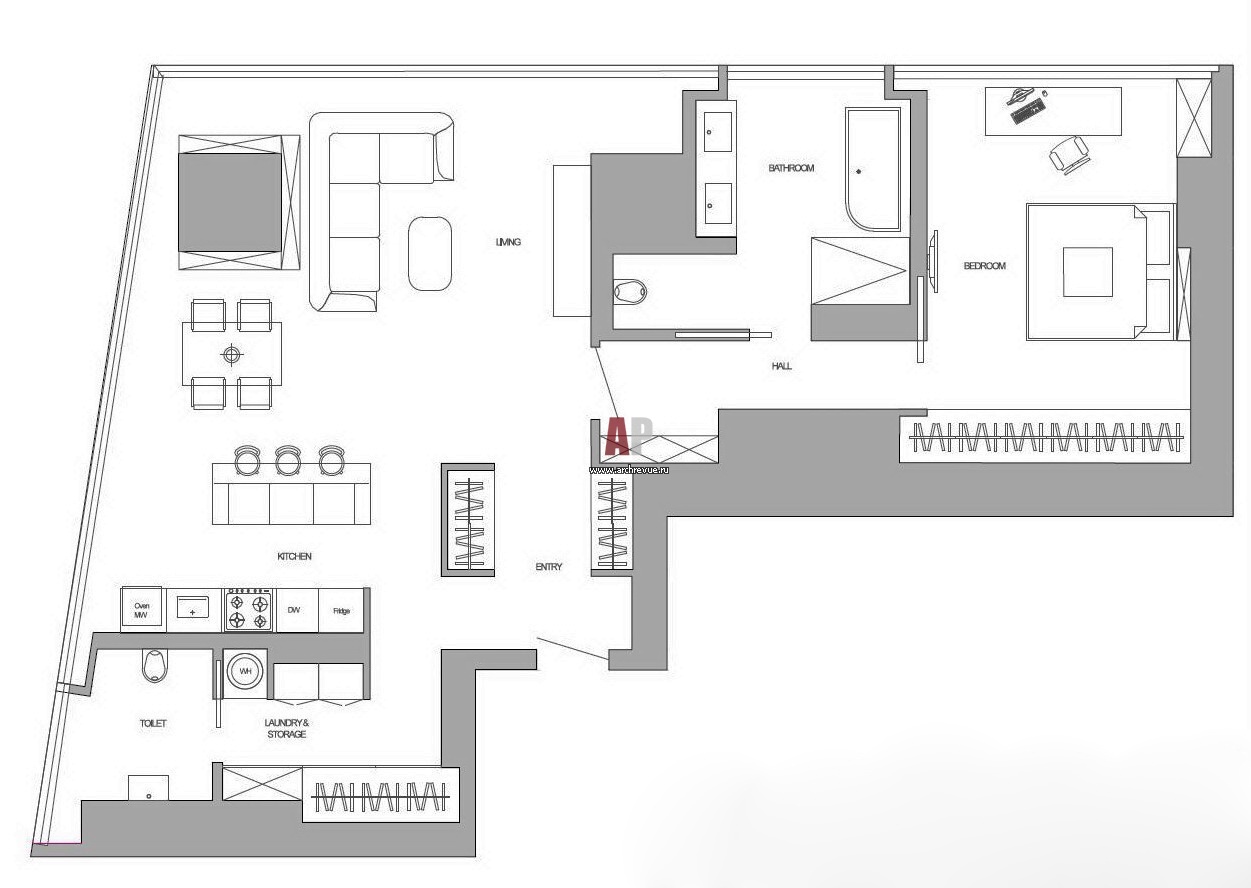 Планировка 2х-комнатной квартиры со студийной гостиной-кухней в стеклянной высотке.