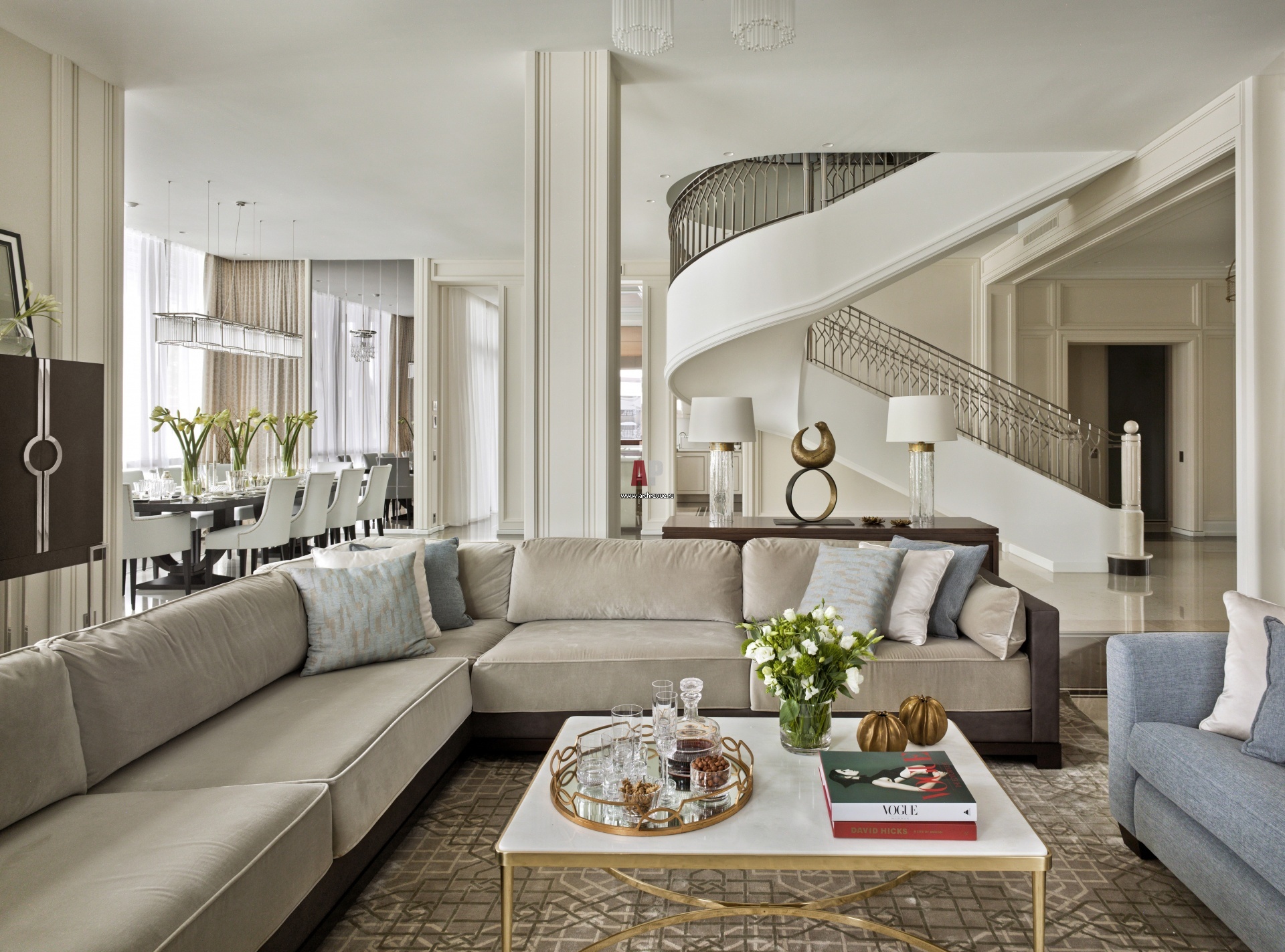 Центральный элемент дома – изящно закрученная лестница с ограждением из белого металла. Угловой диван, JNL. Журнальный столик, Galimberti Nino. Барный шкаф, Mitchell Gold + Bob Williams. Ковер, Riviere Rugs.