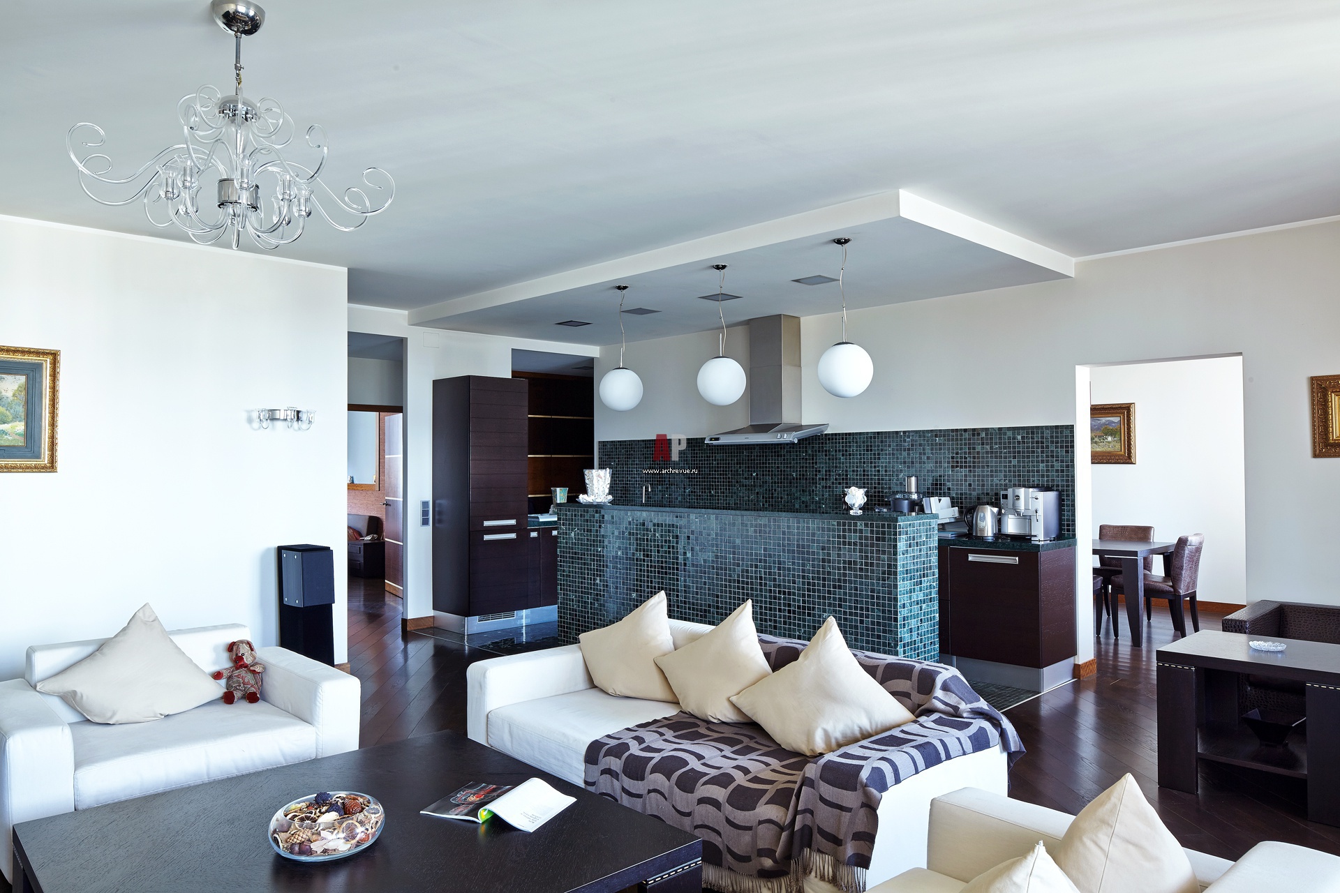 Современный интерьер студийной гостиной строится на контрасте белых стен и темных полов. Декоративный акцент – изумрудная мозаика, которой выделен прямоугольник кухни.