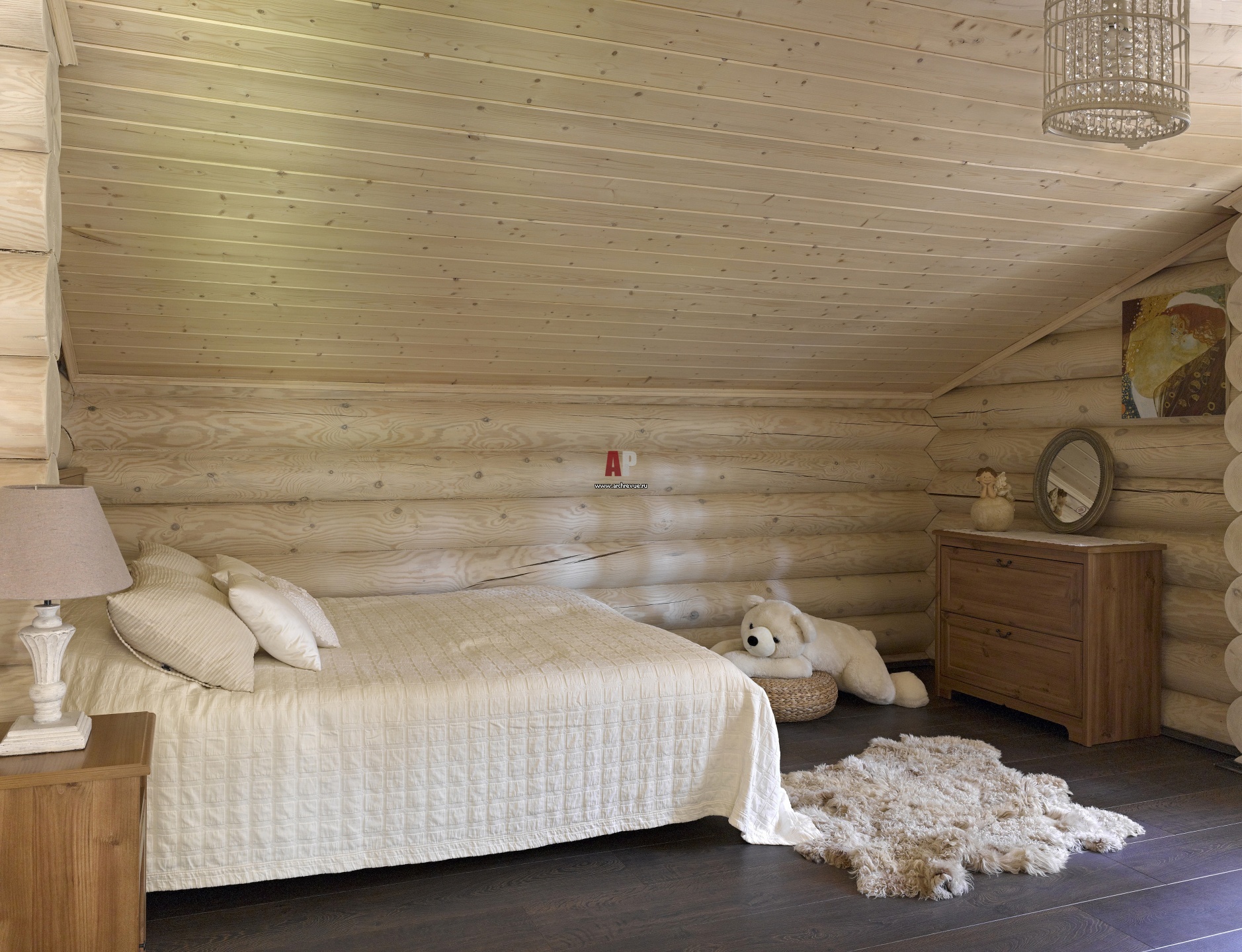 Детская гостевая в мансарде. Стены и потолок выкрашены в общий для дома оттенок светлого дерева.