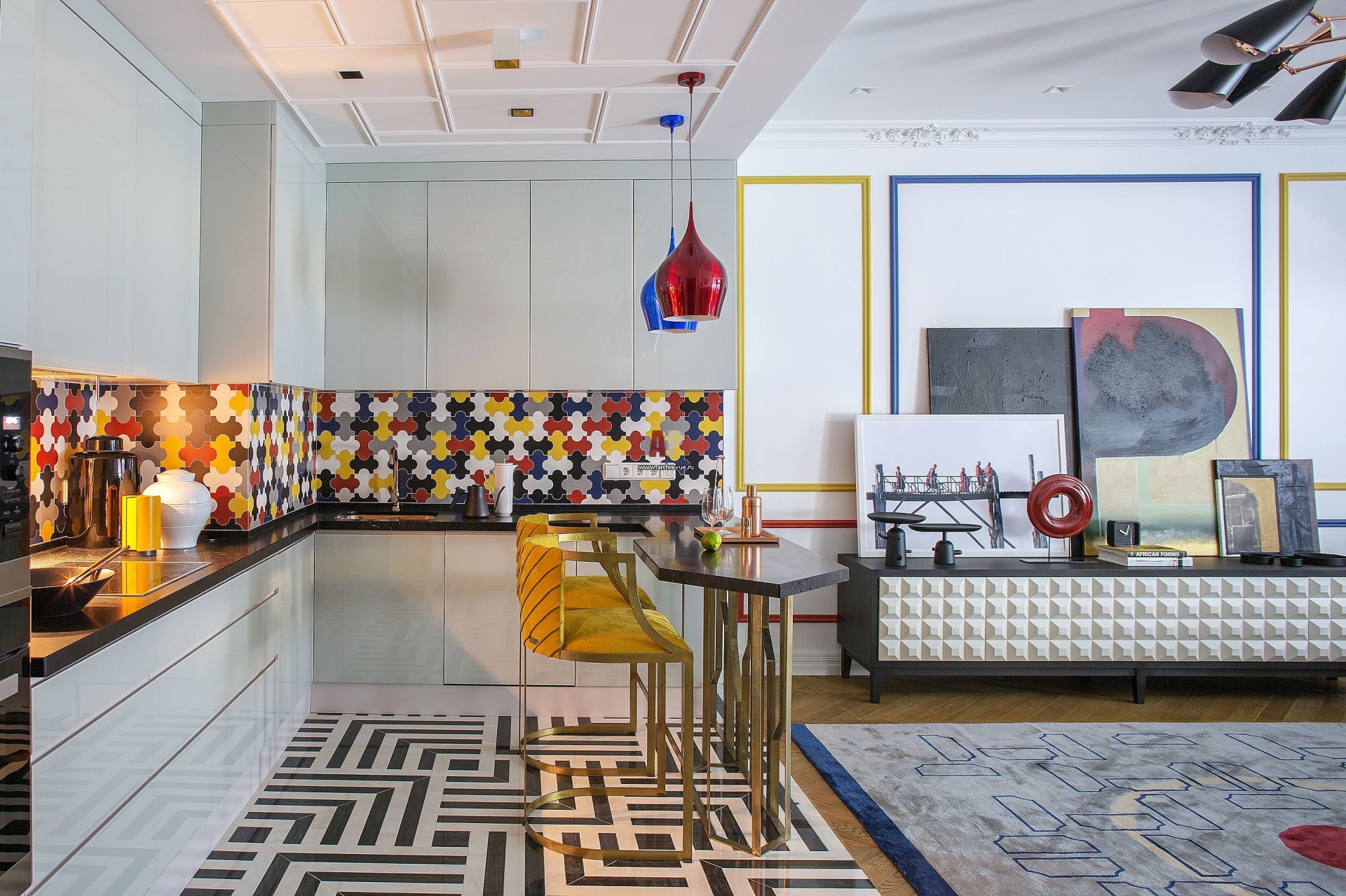 Интерьер кухни. На полу – графичный черно-белый модульный керамогранит Technistone с крупным рисунком в стиле Келли Уестлер. С ним контрастирует кухонный фартук, облицованный плиткой Marazzi (серия Trienale) в форме разноцветного яркого паззла. Золотые барные стулья, Rooma Design & Furniture.