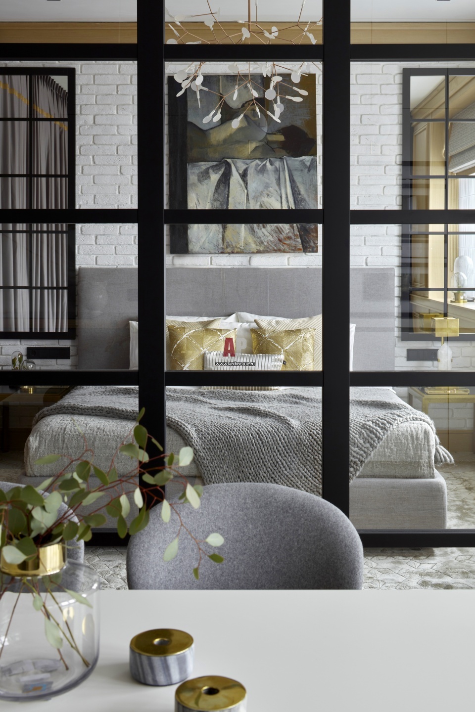 Стеклянная перегородка в раме из черного дерева сделана на заказ, она отделяет приватную зону от общей территории.