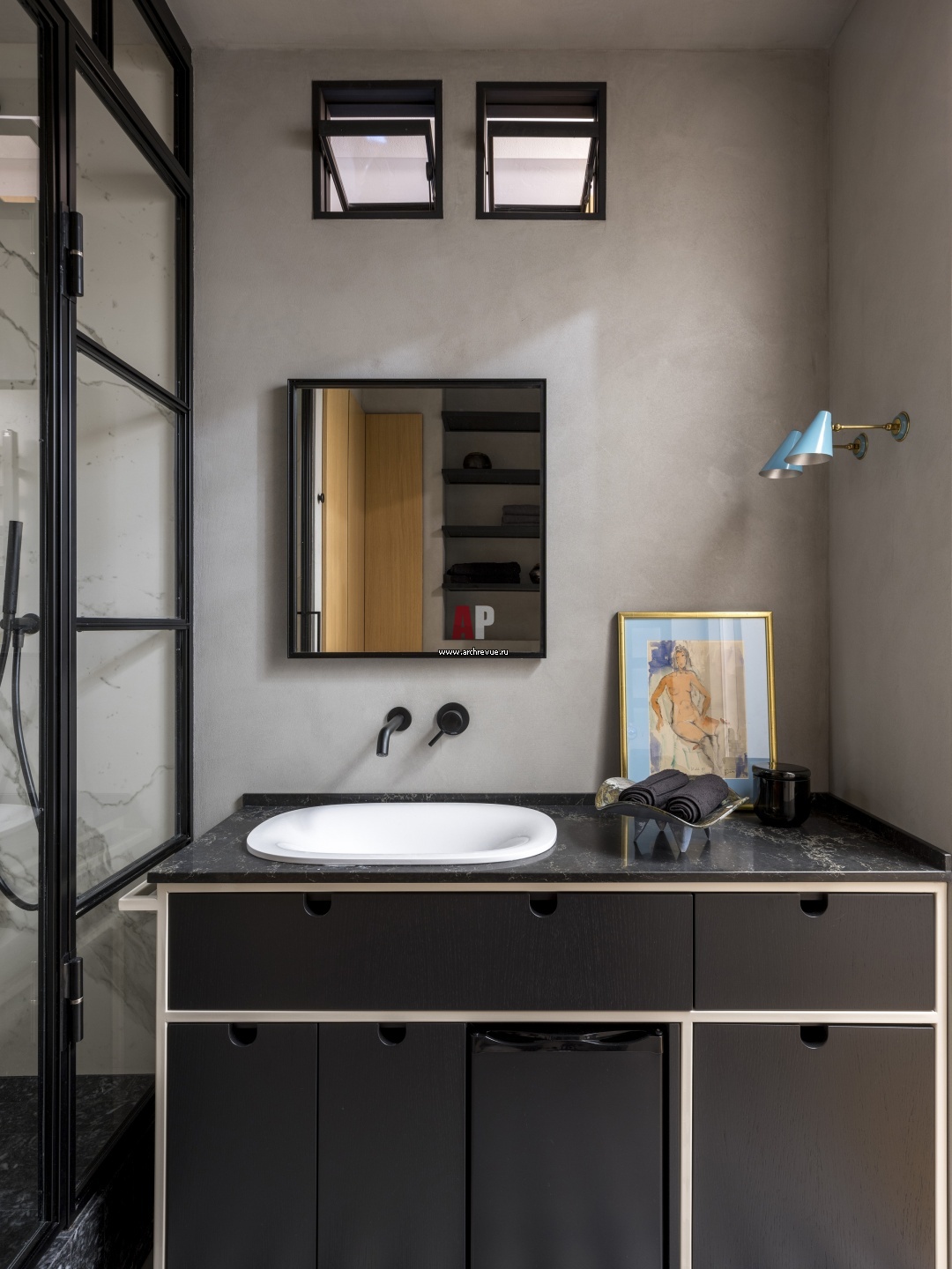 Брутальная квартира для девушки. Интерьер ванной комнаты. Зеркало, умывальник сделан на заказ, в него встроен холодильник для косметики. Раковина, VVilleroy & Boch. Черные смесители, Fantini. Бра, винтаж. Два окна под потолком – декоративные, они рифмуются с оформлением перегородки душевой.
