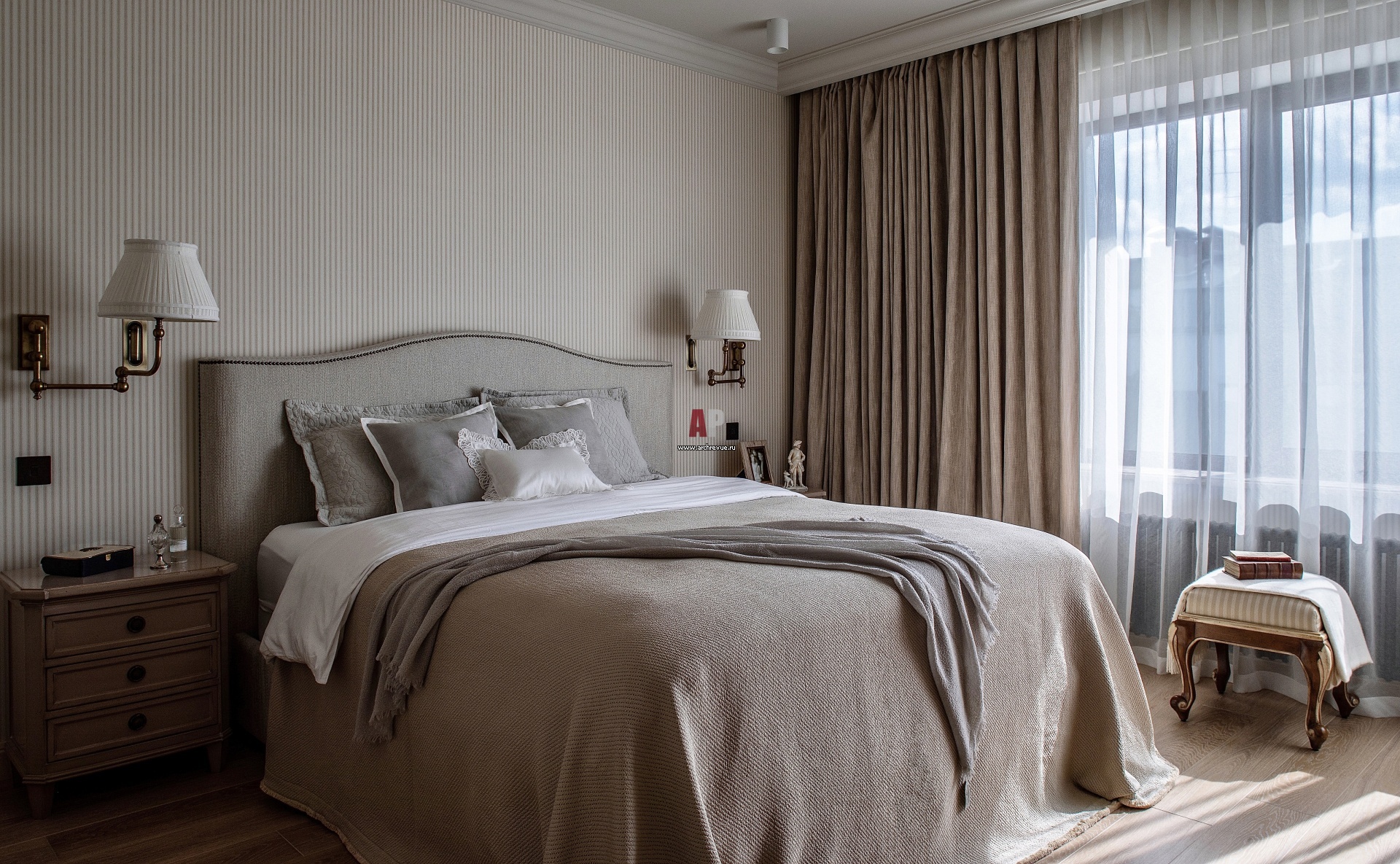 Спальня с нежной палитрой находится на последнем этаже. Стены оформлены светлыми обоями в тонкую полоску. Изголовье кровати из серого текстиля декорировано металлическими клепками. Бра с абажурами, Visual Comfort & Co.