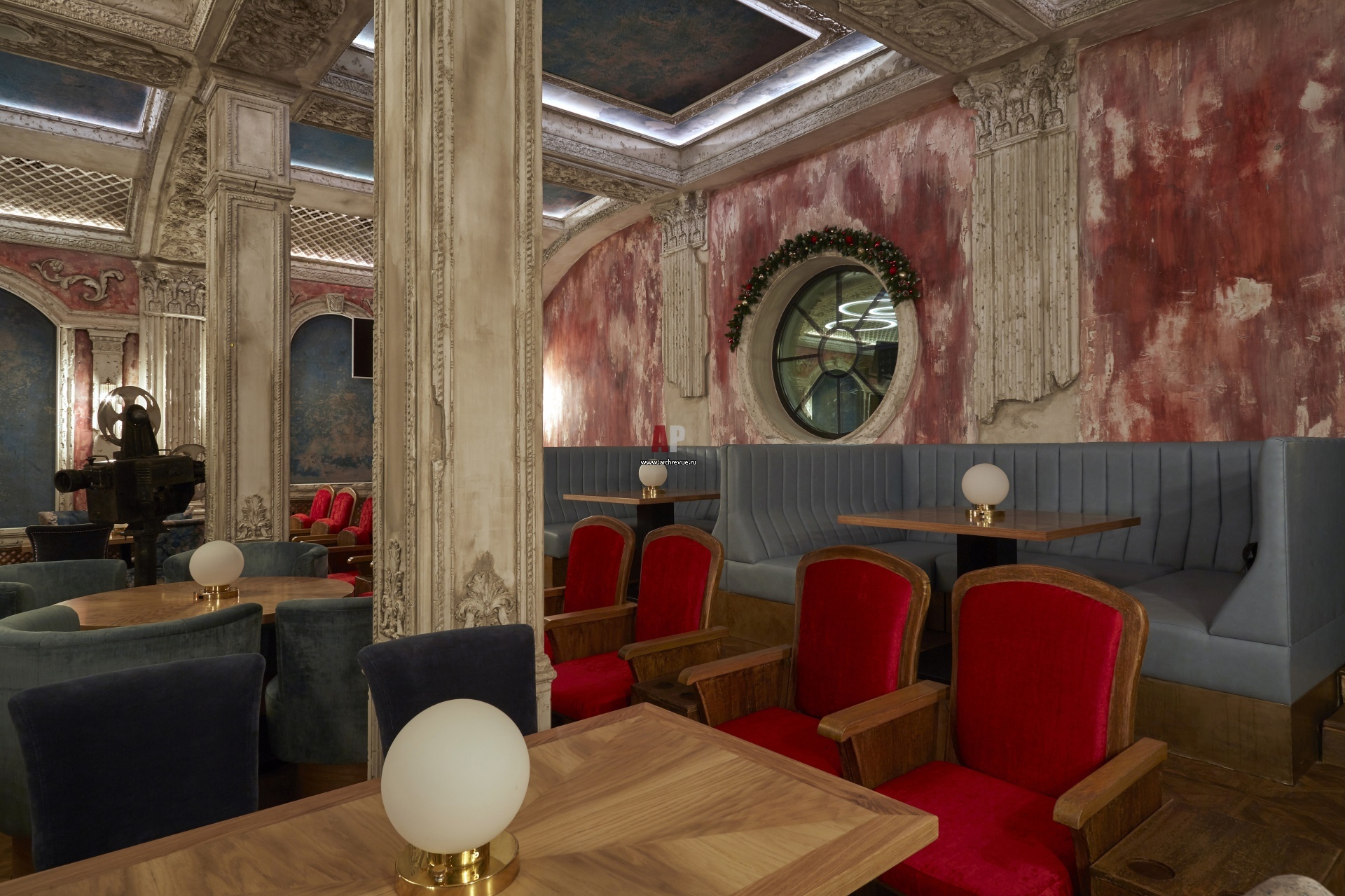 Интерьер зала караоке. Огромную работу потребовало создание антуража старых, потертых со временем стен.