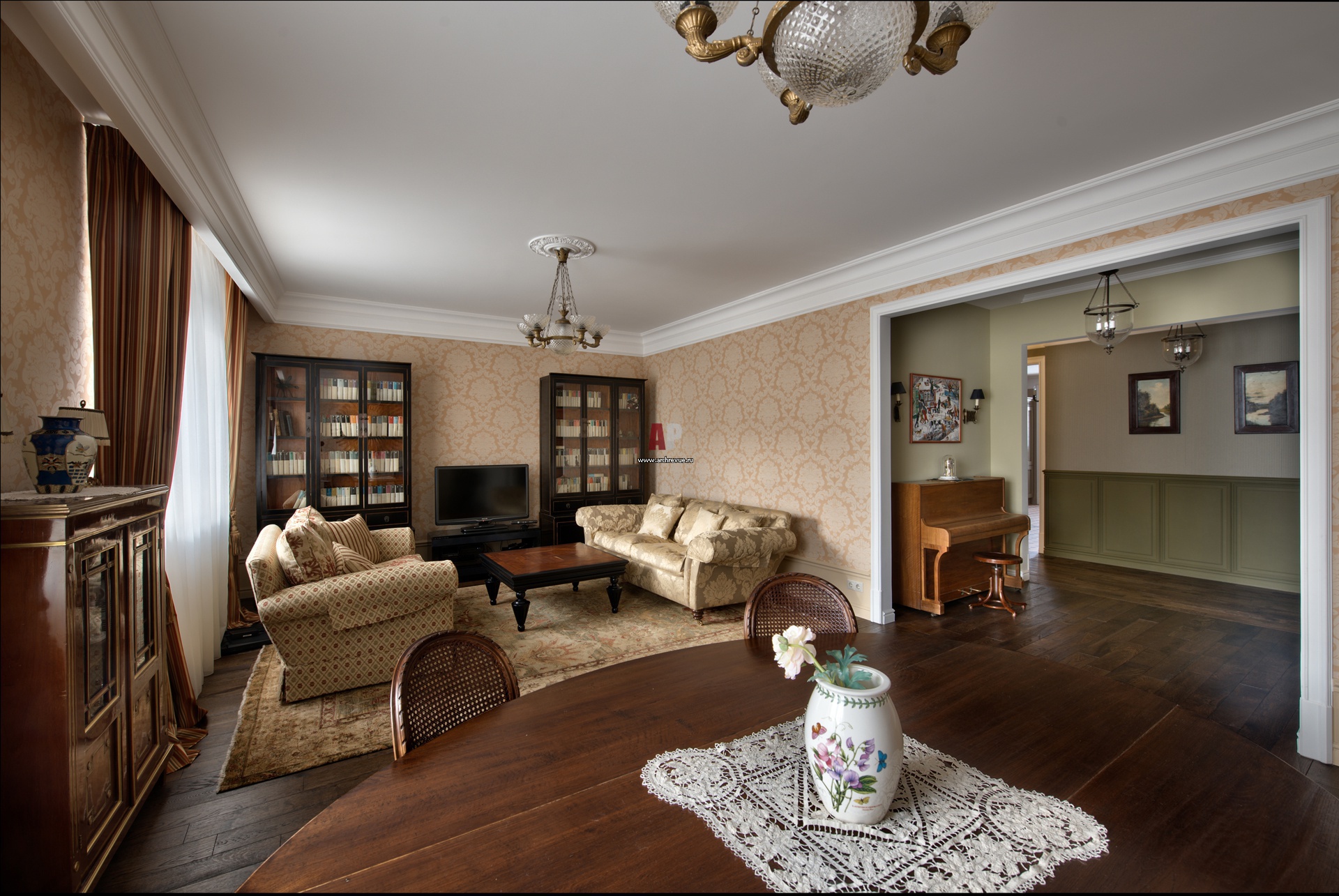 Фото гостиной в золотистых тонах. На полу – массивная мореная дубовая доска с брутальной фактурой. На стенах – бумажные обои из английской коллекции «Ампир Декор». Карнизы, высокие плинтусы, обрамление дверного проема от бельгийской фабрики Orac Decor.