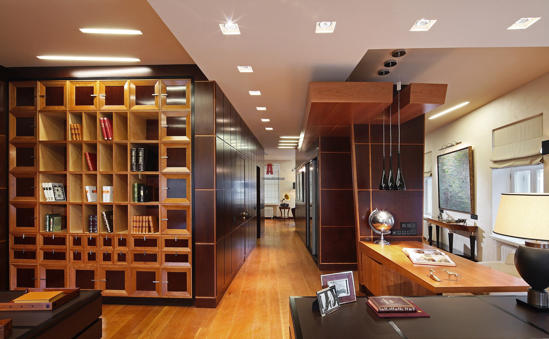 Вид из рабочей зоны на входную группу и переговорную. На полу – палубная широкая доска из древесины вишни.