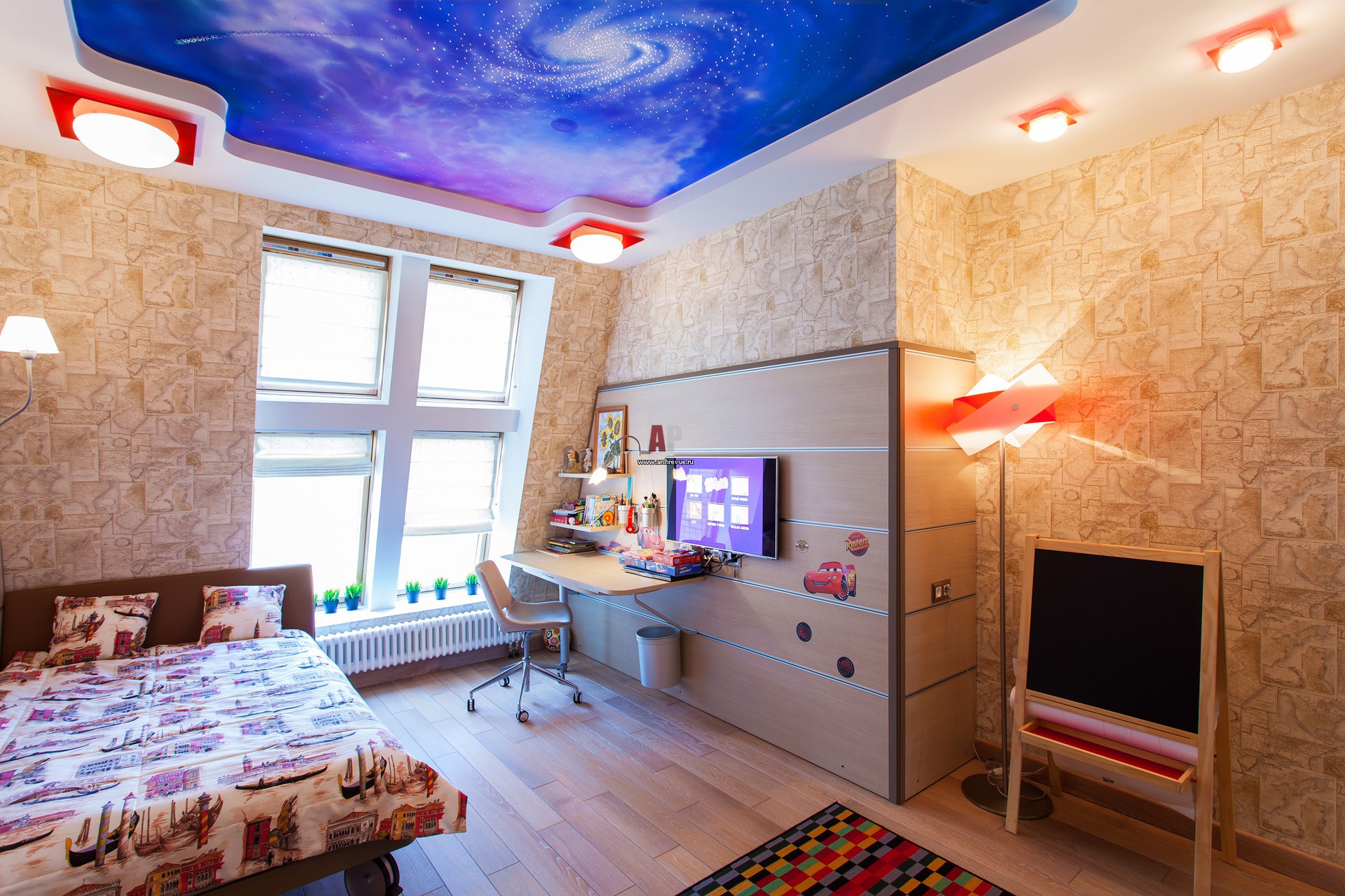 Фото интерьера детской комнаты мальчика в современном стиле. На потолке создан эффект звездного неба.