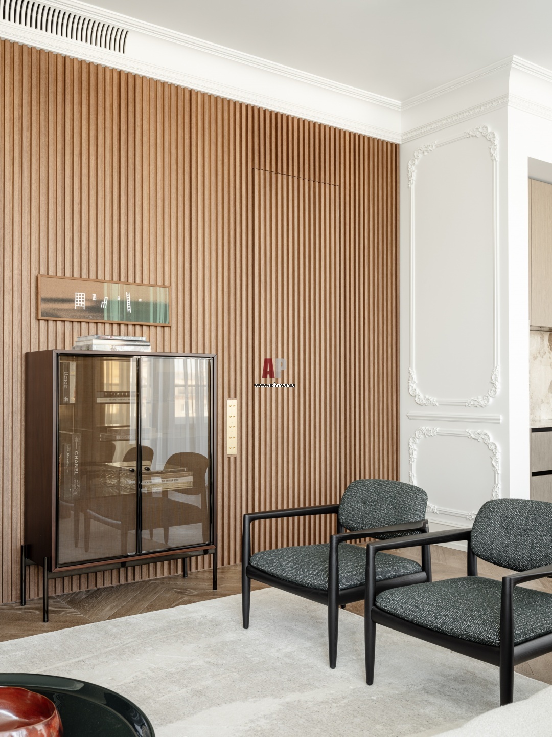 Приватный блок с внутренним холлом, кабинетом, а также детской зоной отделен от гостиной реечной стеной. В нее спрятана потайная дверь. Изделия из дерева «Ассоциация русских мастеров».