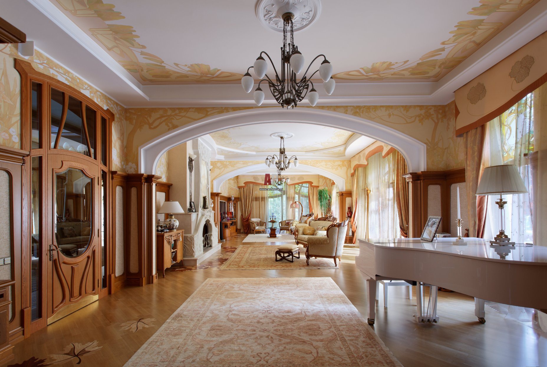 Первый этаж решен как анфилада перетекающих пространств. Диванная, каминная, музыкальная зона, столовая сменяют друг друга через широкие порталы. На полу – наборный паркет из дуба, изготовленный компанией «Ковчег-паркет» Изделия из дерева выполнены на заказ, изготовление «СЛК » и Mobile Line Décor