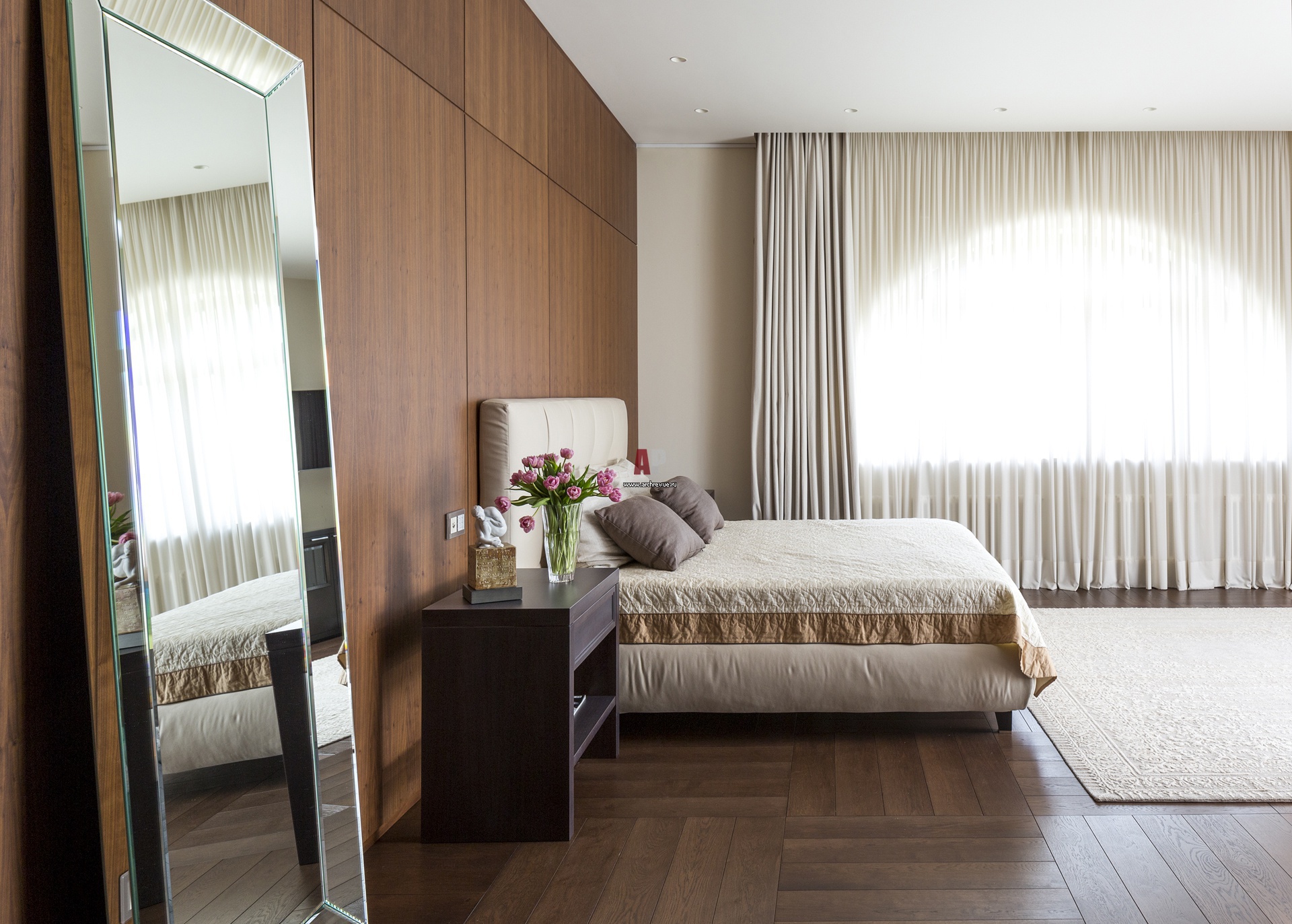 Интерьер хозяйской спальни выполнен в современном стиле с деревянной отделкой стены за изголовьем кровати. С масштабом стеновых панелей рифмуется напольное зеркало прямоугольной формы.