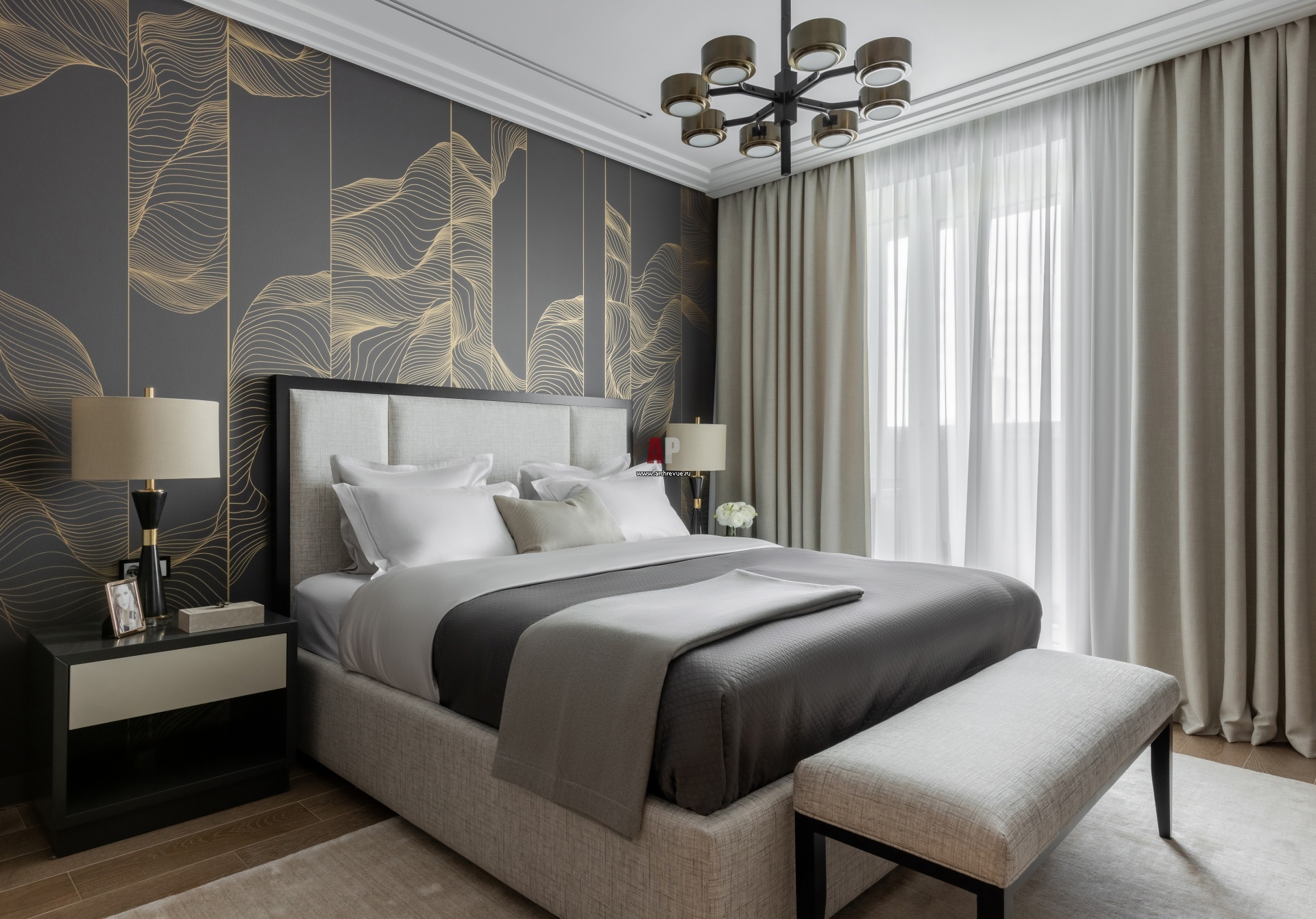 Спальня оформлена в темных цветах. Обои с ручным золотым рисунком, Fresq. Кровать и тумбы сделаны на заказ. Потолочный светильник, Arteriors.