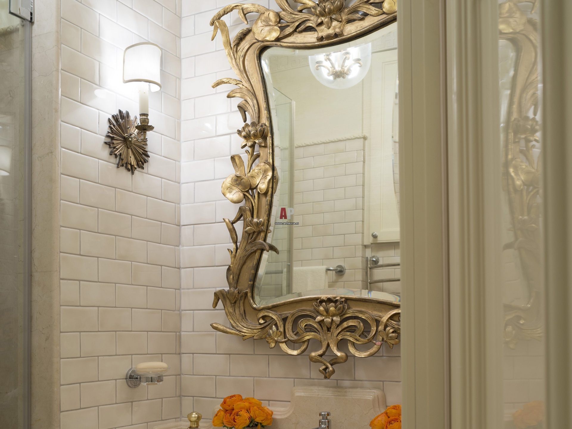 Декоративный акцент светлой ванной комнаты – зеркало в роскошной винтажной бронзовой раме.