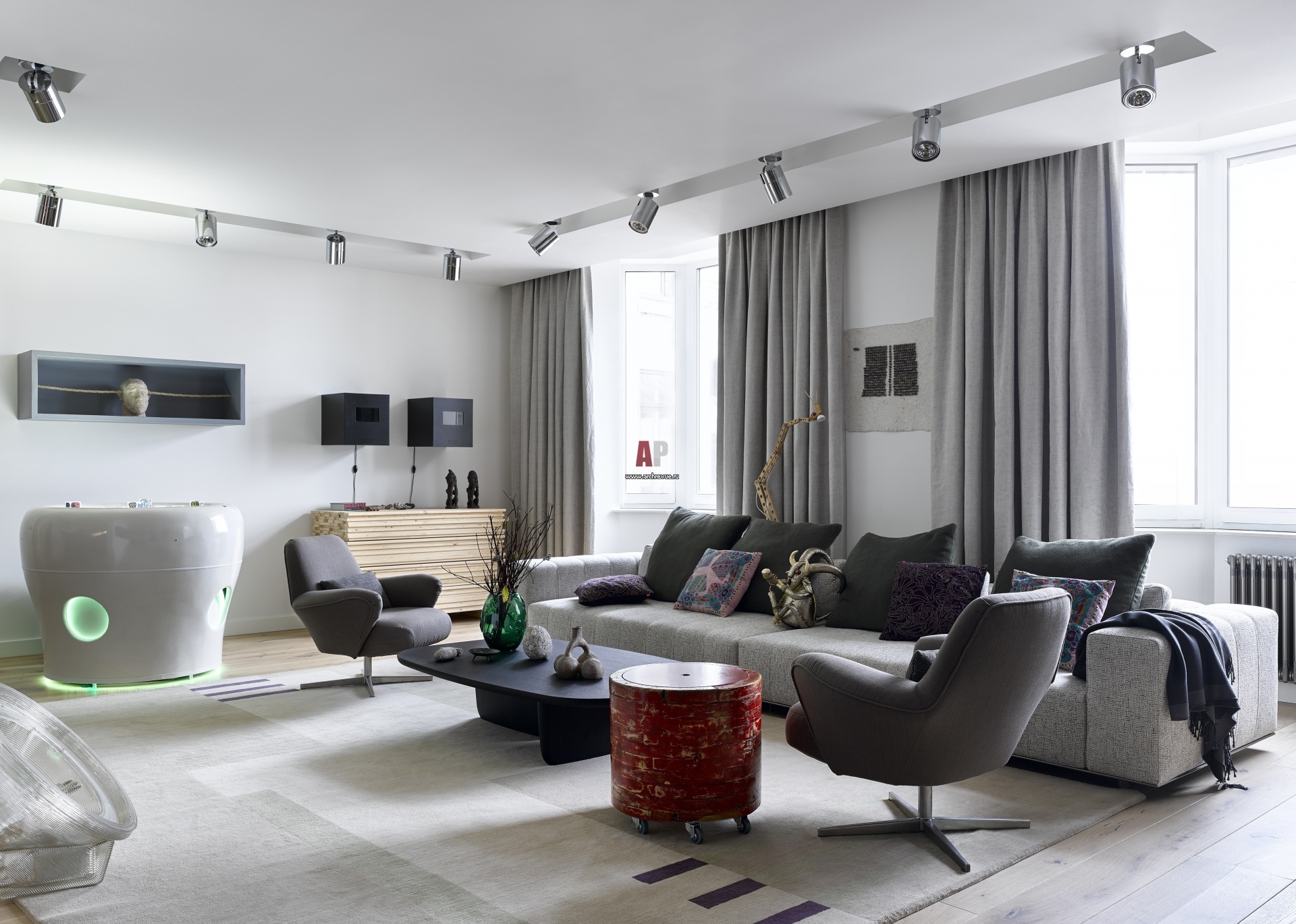 Доминанта гостиной – инновационный музыкальный инструмент Reactable с сенсорным управлением, футуристический дизайн корпуса выполнен специально для данного проекта.