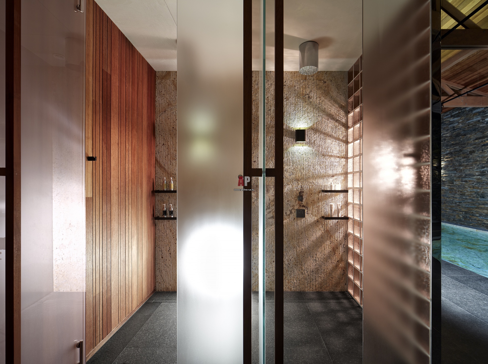 Душевая комната в зоне СПА. Стены отделаны камнем и красным деревом, двери из стекла.