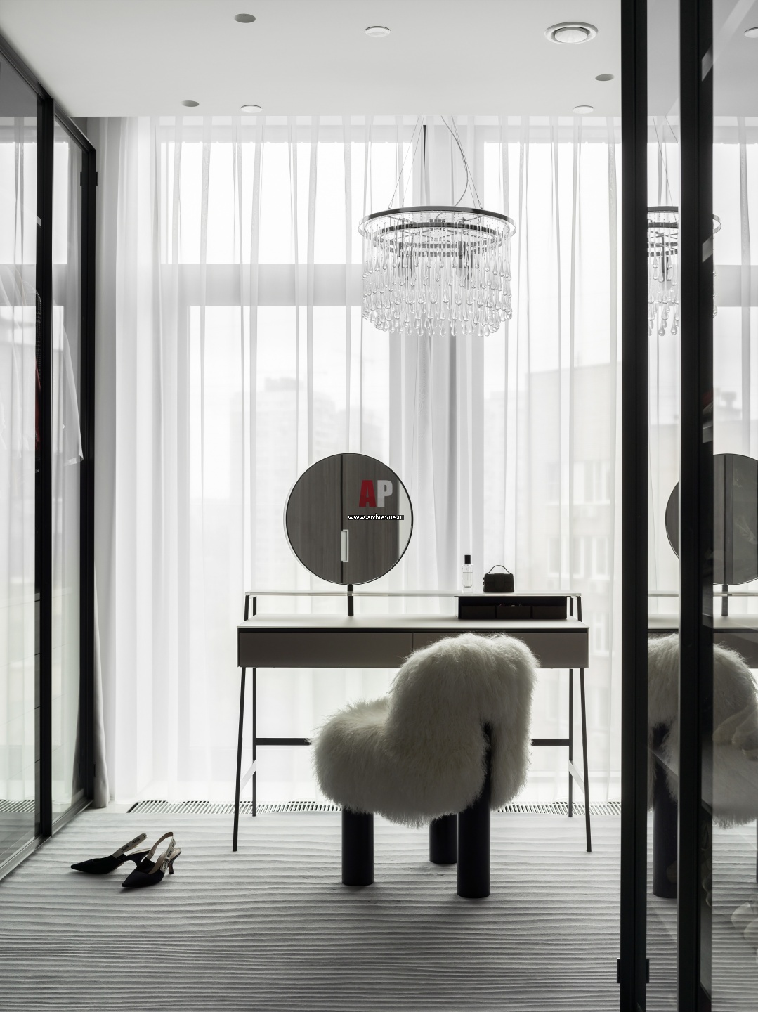 К спальне хозяев примыкает гардеробная. Наполнение – стеклянные шкафы, Porro. Туалетный столик, Gallotti & Radice. Люстра, Ochre.