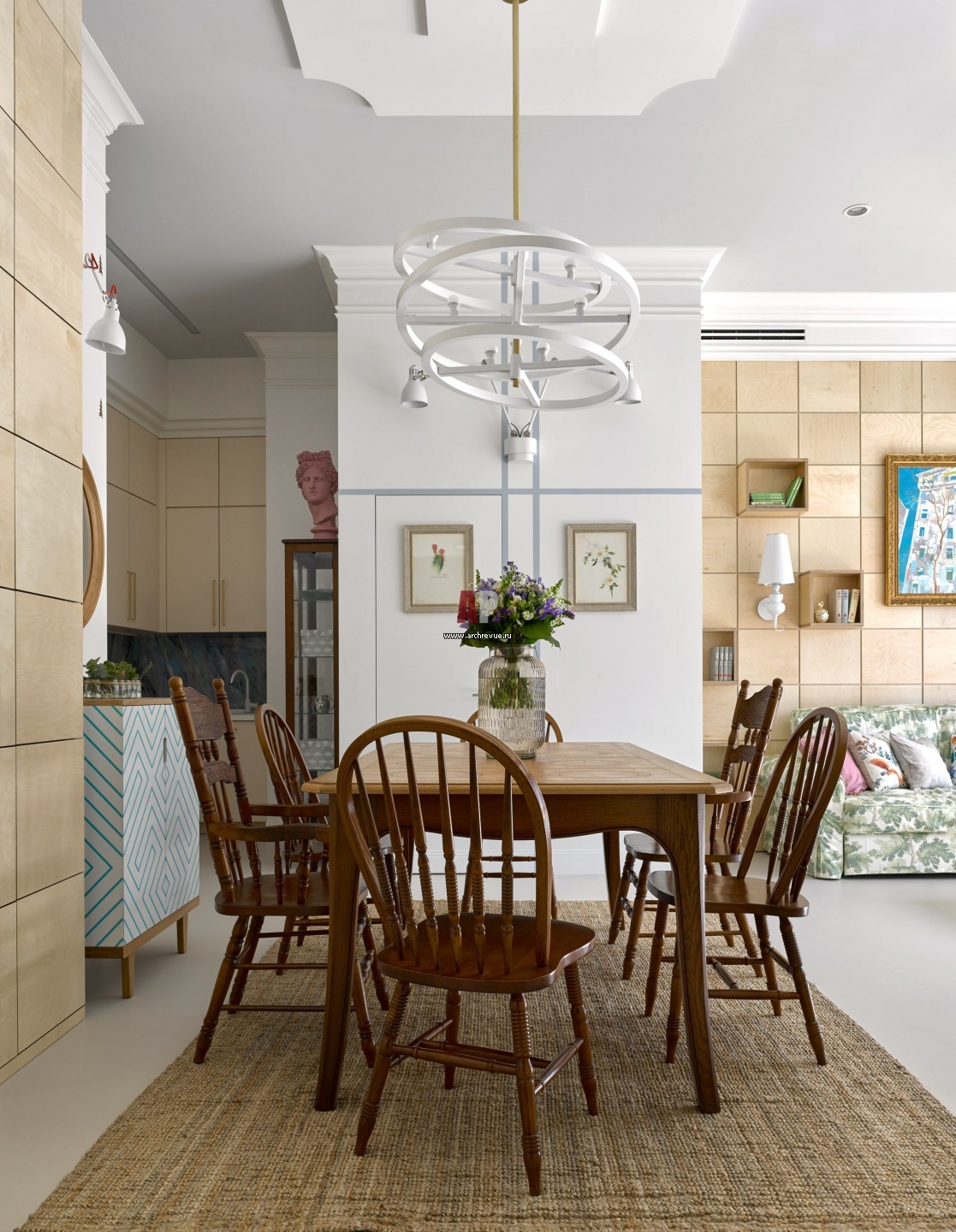 Центральный элемент столовой зоны – стол Busato, который заказчики привезли с собой, и оригинальная люстра. Она изготовленная по авторским эскизам в московской мастерской.