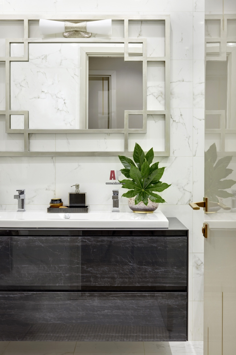 Интерьер санузла квартиры выполнен в природных тонах. Фасад подвесного умывальника облицован черным камнем.