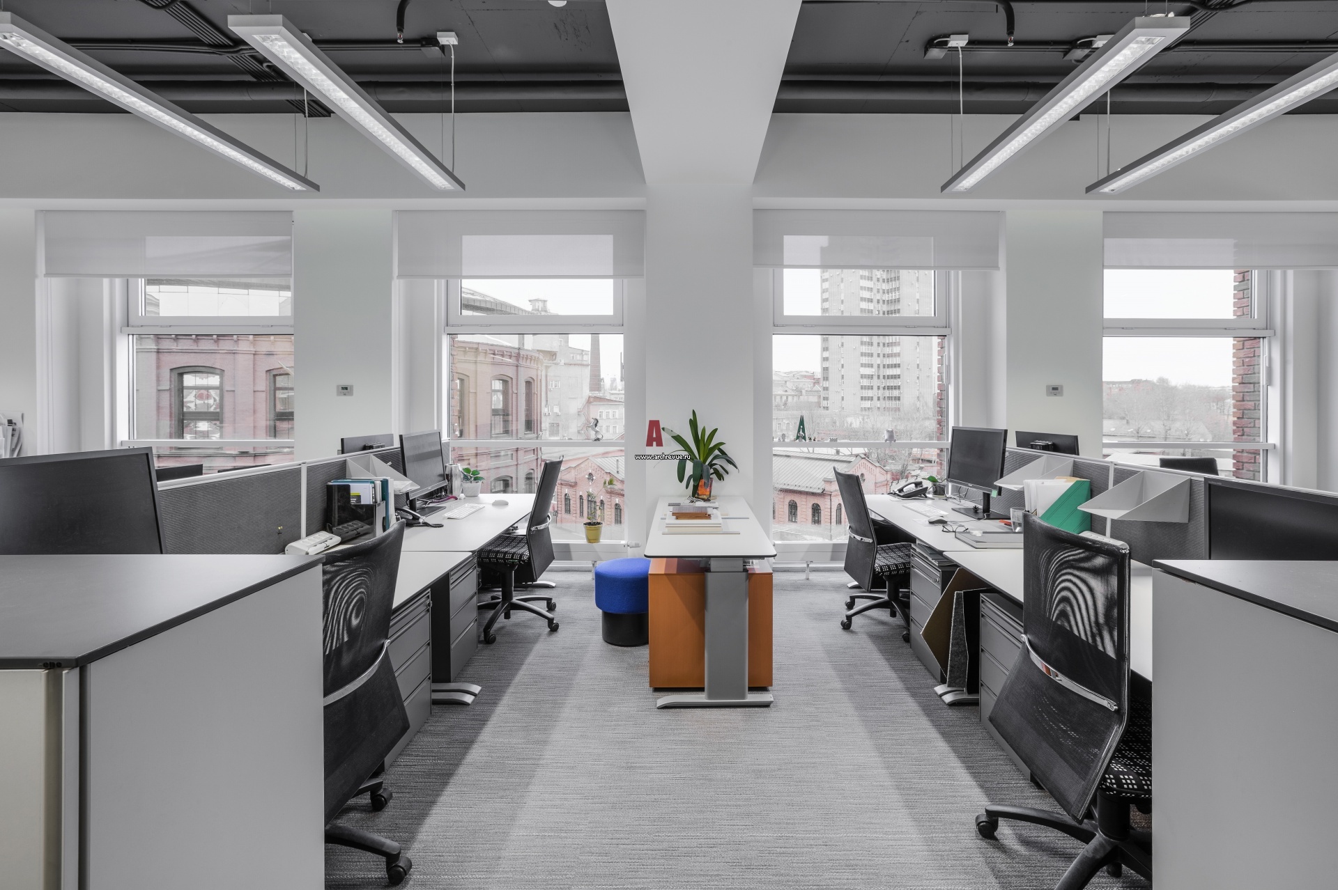 Рабочий open space зонируют острова с открытыми рабочими столами размером 180 х 80 см, предназначенные для работы с чертежами и образцами строительных и отделочных материалов. Столы меблированы мобильными пуфами, Vitra и Bene.