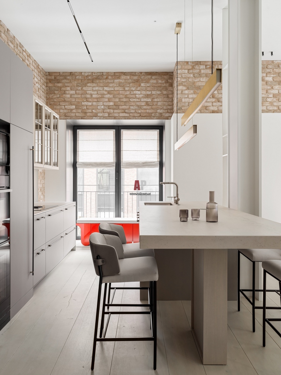Остров кухни играет роль столовой. Барные стулья, Formitalia, коллекция Aston Martin, модель V242. Подвесные декоративные латунные светильники, Baxter, модель Blade.