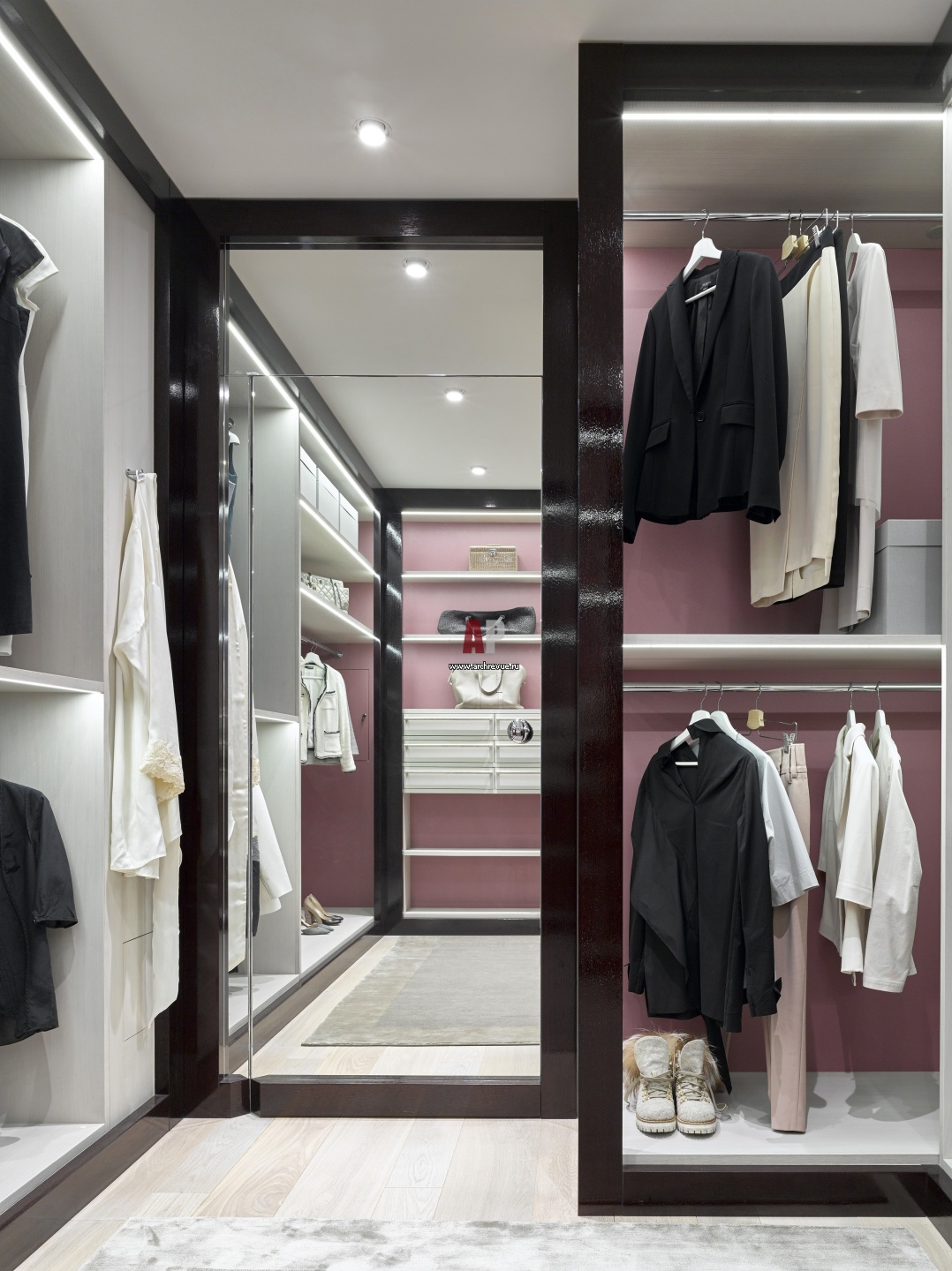 Респектабельная квартира для семьи бизнес-леди. Открытая гардеробная с лиловым задником при мастер-спальне.