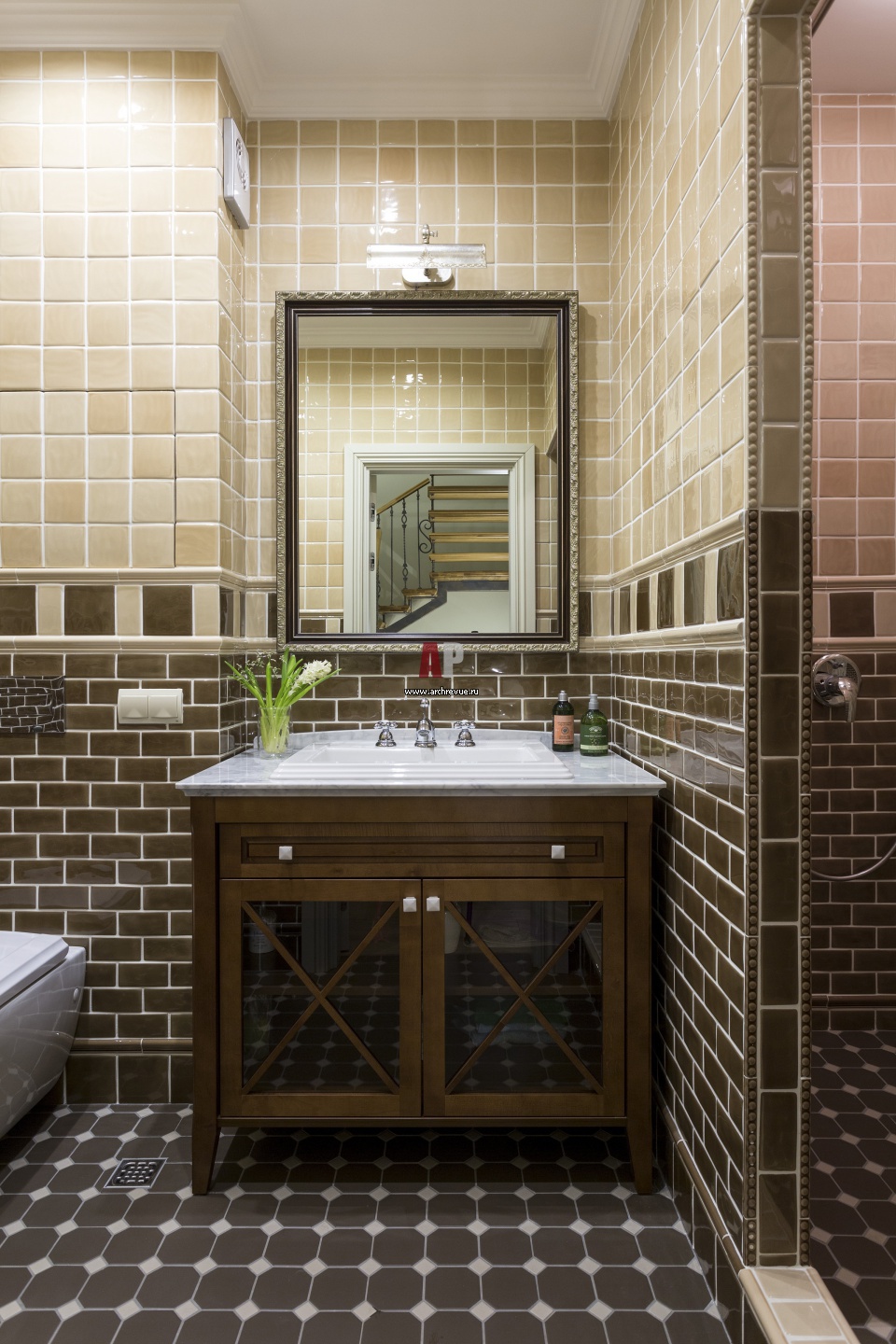 Интерьер санузла в отделке английской керамической плиткой шоколадного и бежевого оттенков. Сантехника, Villeroy & Boch.