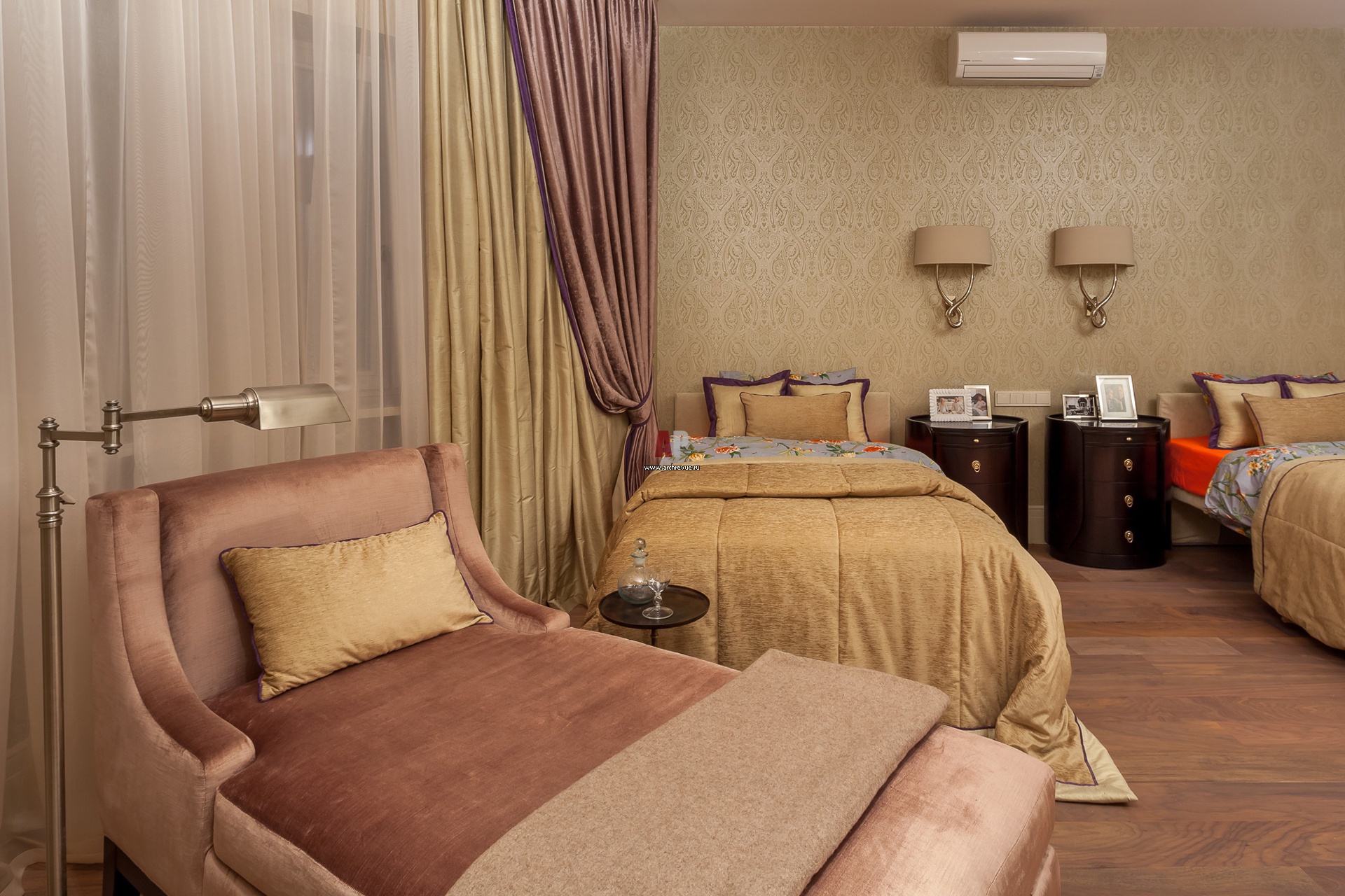 Интерьер спальни в теплой бежево-охристой цветовой гамме.
