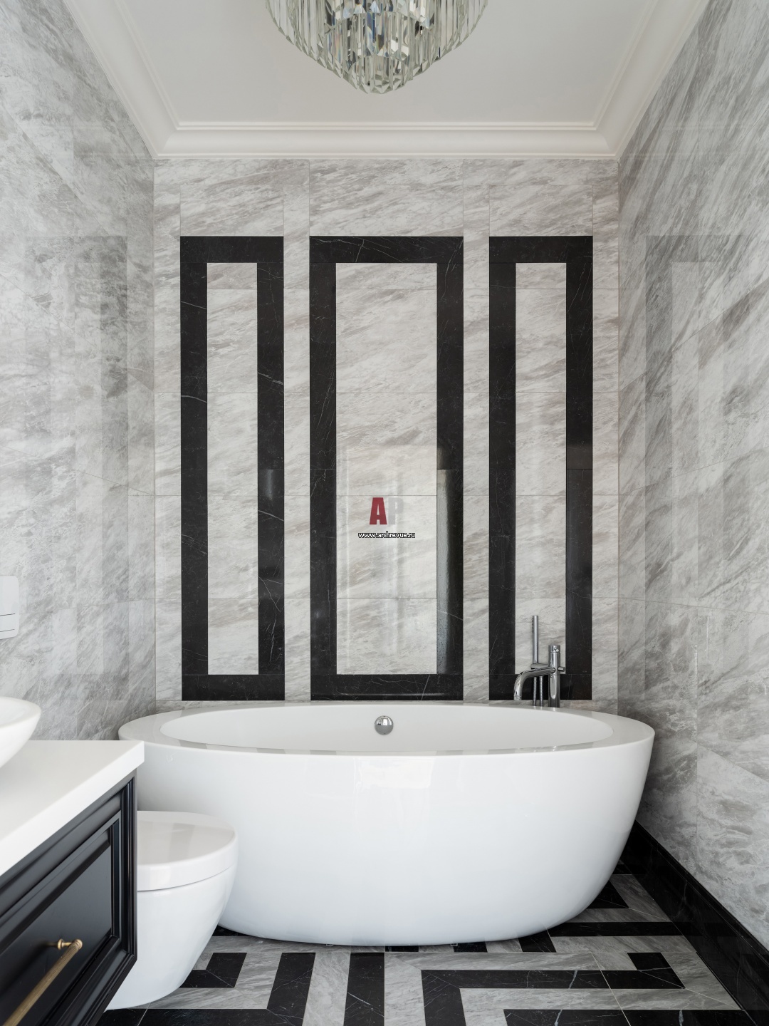 Каменный декор стены за ванной повторяет раскладку молдингов в спальнях. Отдельно стоящая ванна, BelBagno.