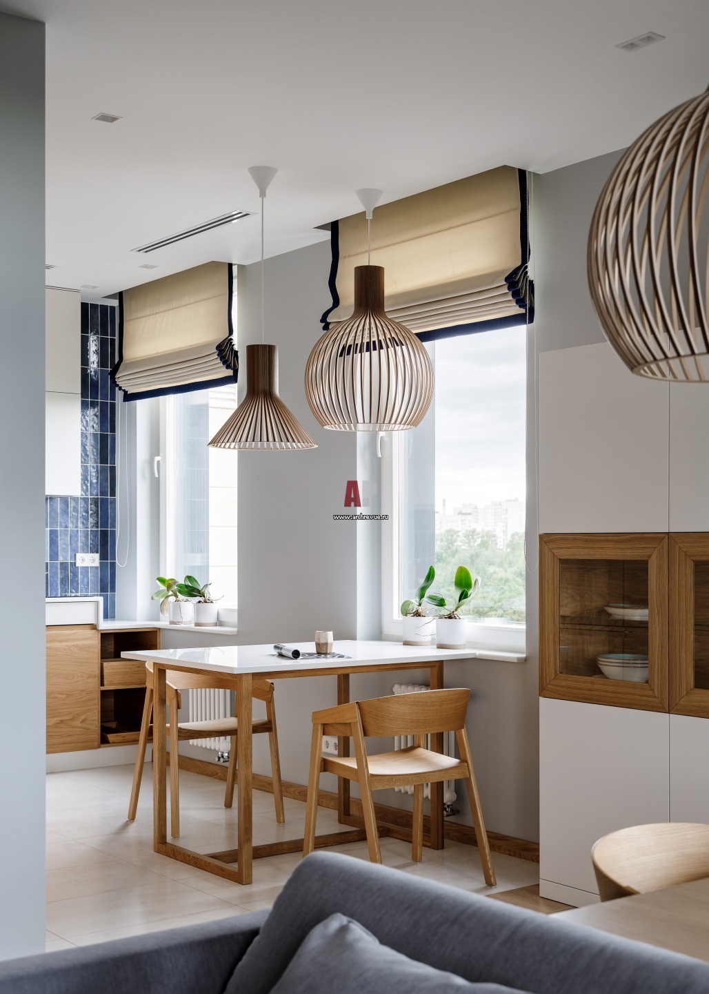 В простенке возле стола для завтраков размещена консоль-витрина, Hubsch. На окнах – римские шторы бежевого цвета с темно-синим кантом.