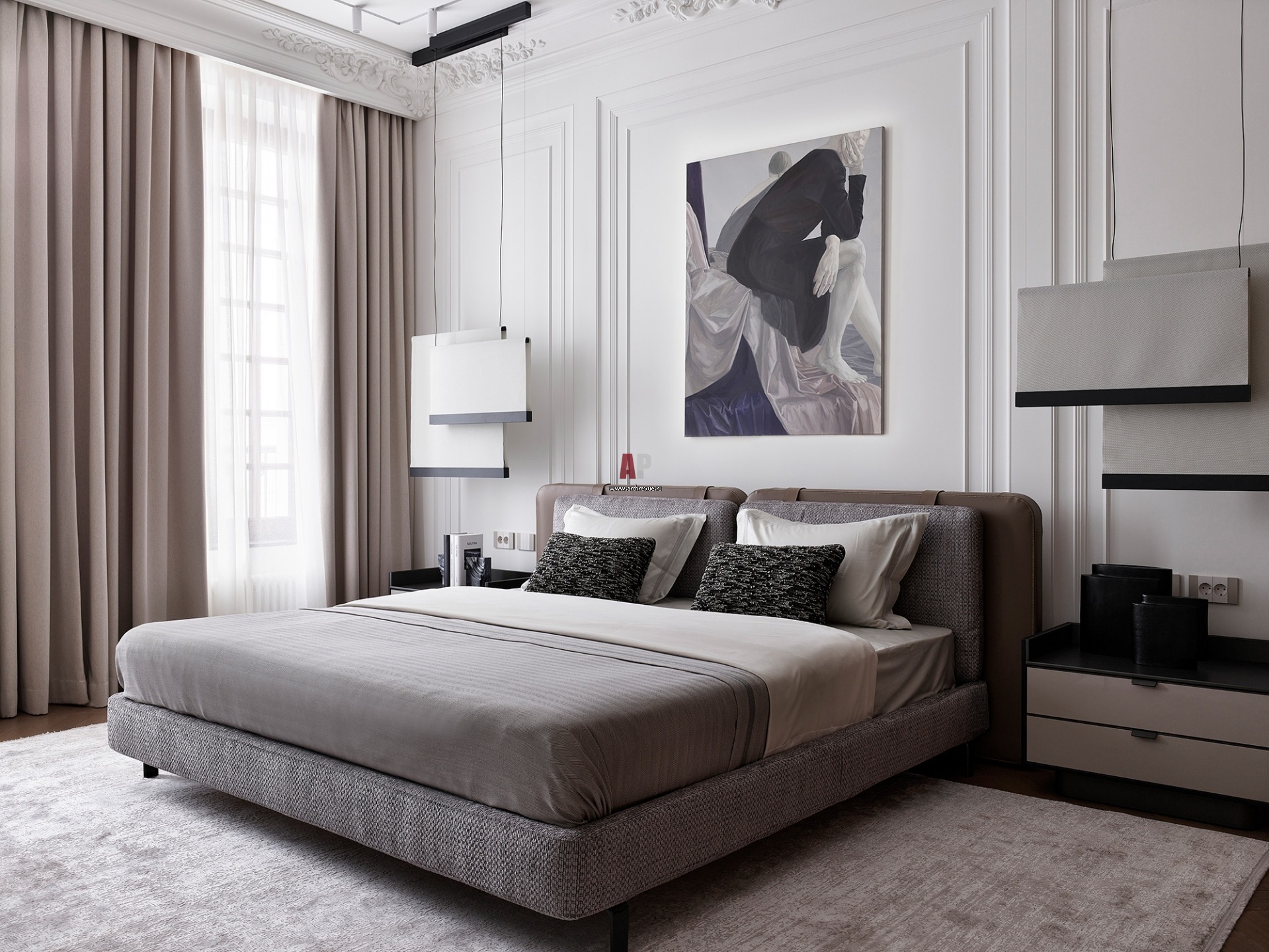 Хозяйская спальня оформлена в молочной палитре с классическими молдингами на стенах. Кровать, тумбы и комод, Minotti. Подвесные светильники, Vibia.