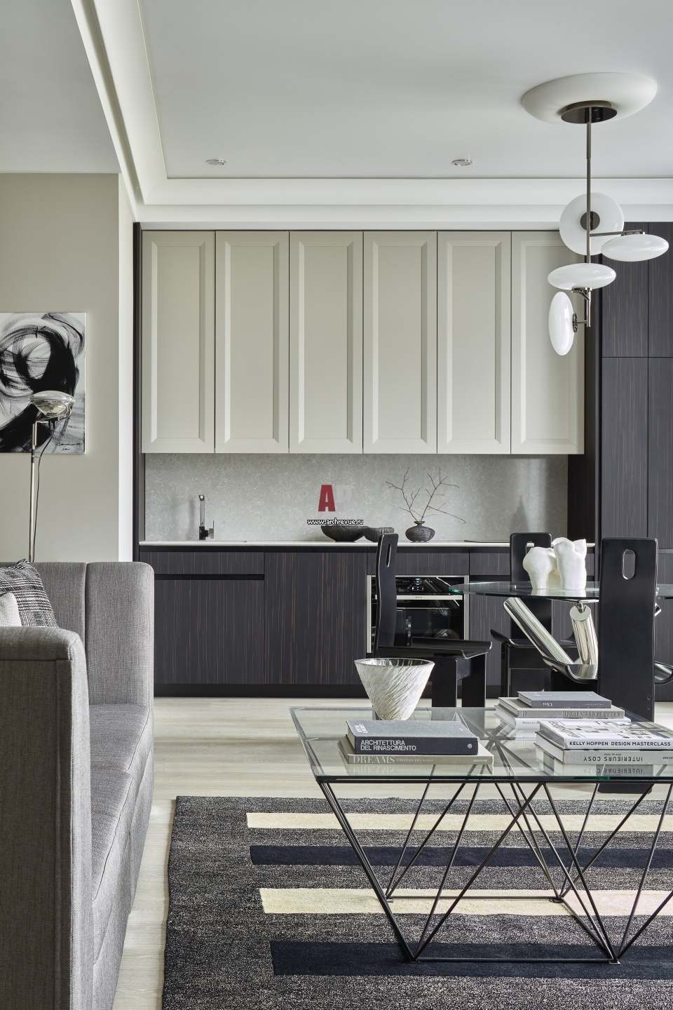 Кухонный гарнитур сделан на заказ. Фасады шкафов оформлены аккуратными классическими филенками. Люстра, Penta.