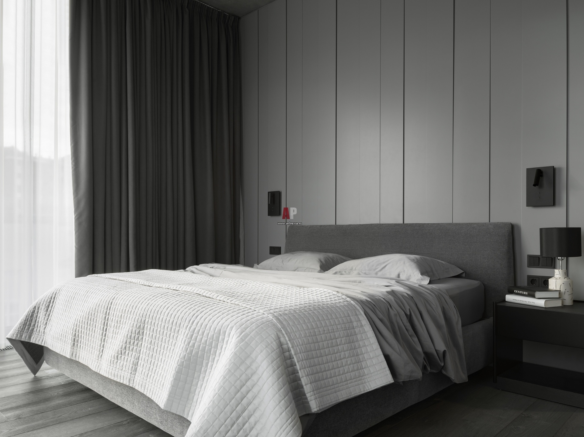 Семейная квартира в стиле минимализм. Интерьер хозяйской спальни в серой монохромной палитре.