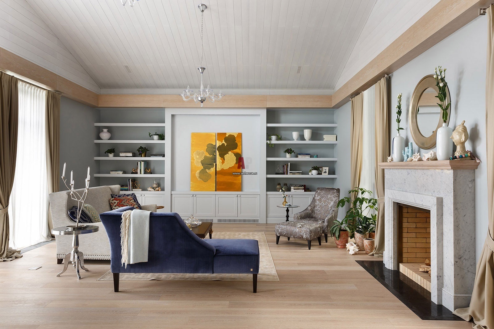 Приватная зона отдыха с дровяным камином в стиле фьюжн. Кушетка, Tosconova. Кресло Casamilano в обивке Rubelli. Столик Vittorio Grifoni. Люстра, De Majo Illuminazione. На стене работа «Цветение» Ш. Шпихера.