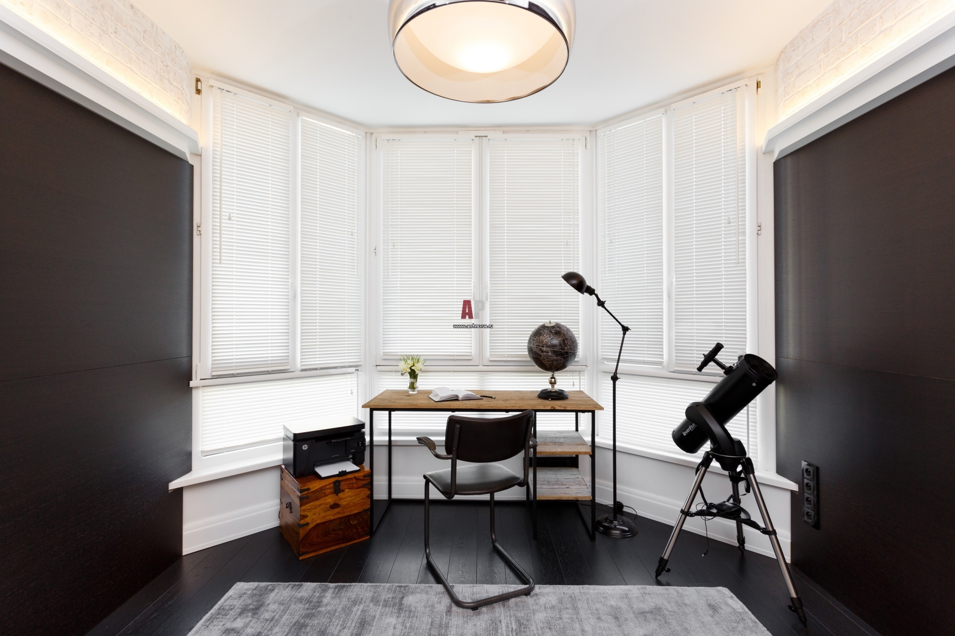 Холл площадью 44 кв. м заканчивается эркером, здесь было решено сделать открытый кабинет. Он выделен черными стенами и паркетной доской цвета «темный шоколад».