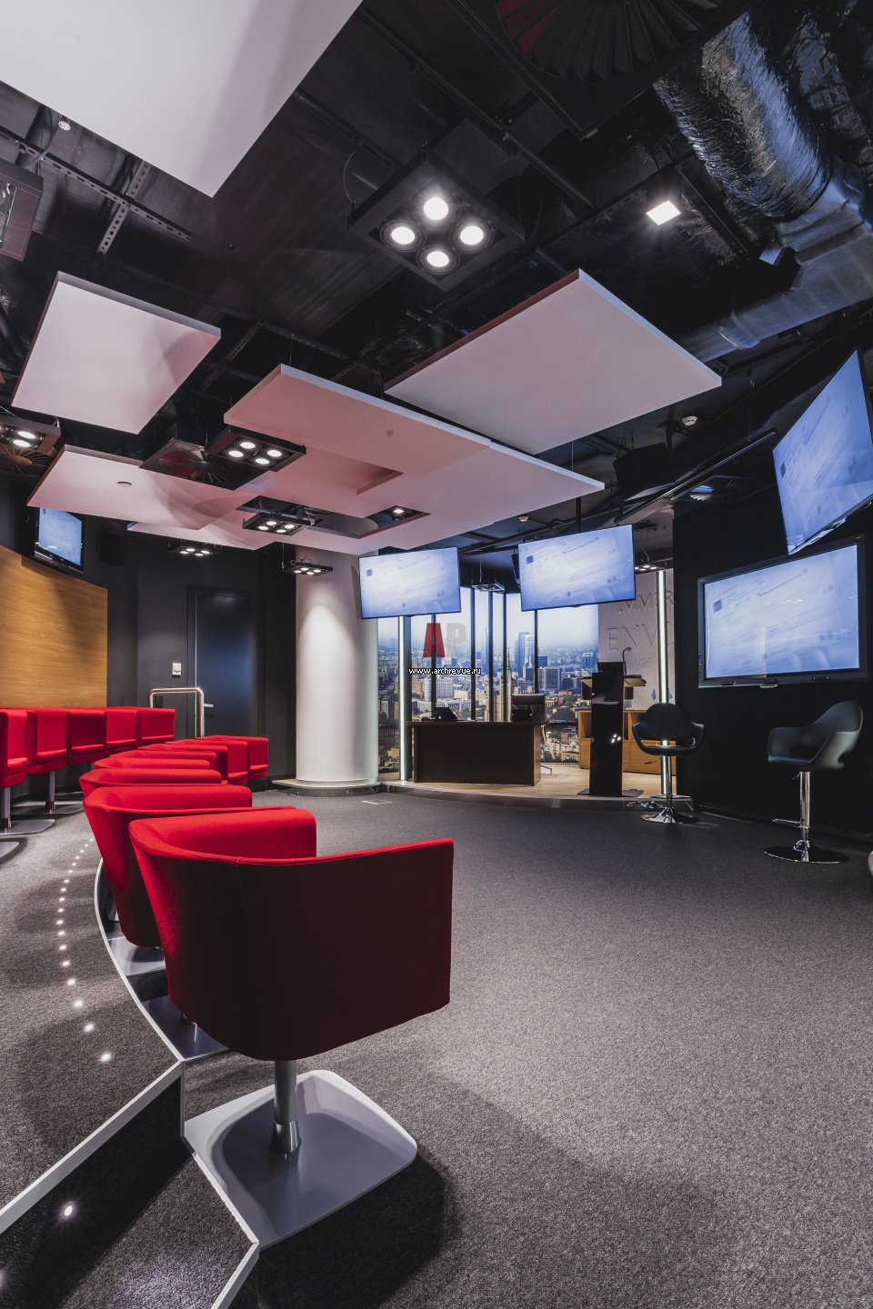 Фото интерьера главного презентационного зала. Все, что выводится на экране его компьютера, тут же транслируется на мониторы, расположенные по всему периметру помещения. Ярко красный цвет кресел, расположенных полукругом, деревянная облицовка стен, черный глубокий потолок также отсылают к эстетике настоящего театрального зала и сцены.