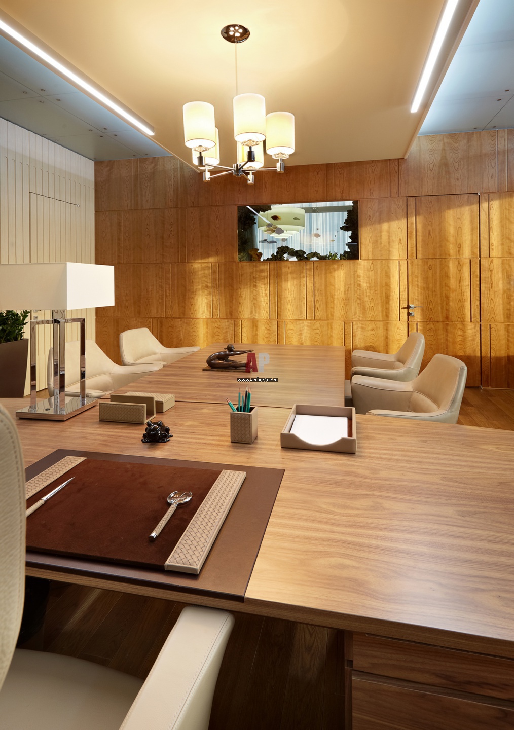 Стены кабинета в офисе зашиты панелями из светло-коричневого дерева с красивой фактурой. В стене напротив рабочего стола смонтирован аквариум с тропическими рыбками. Чтобы обеспечить доступ к оборудованию аквариума, часть панелей сделана съемными.