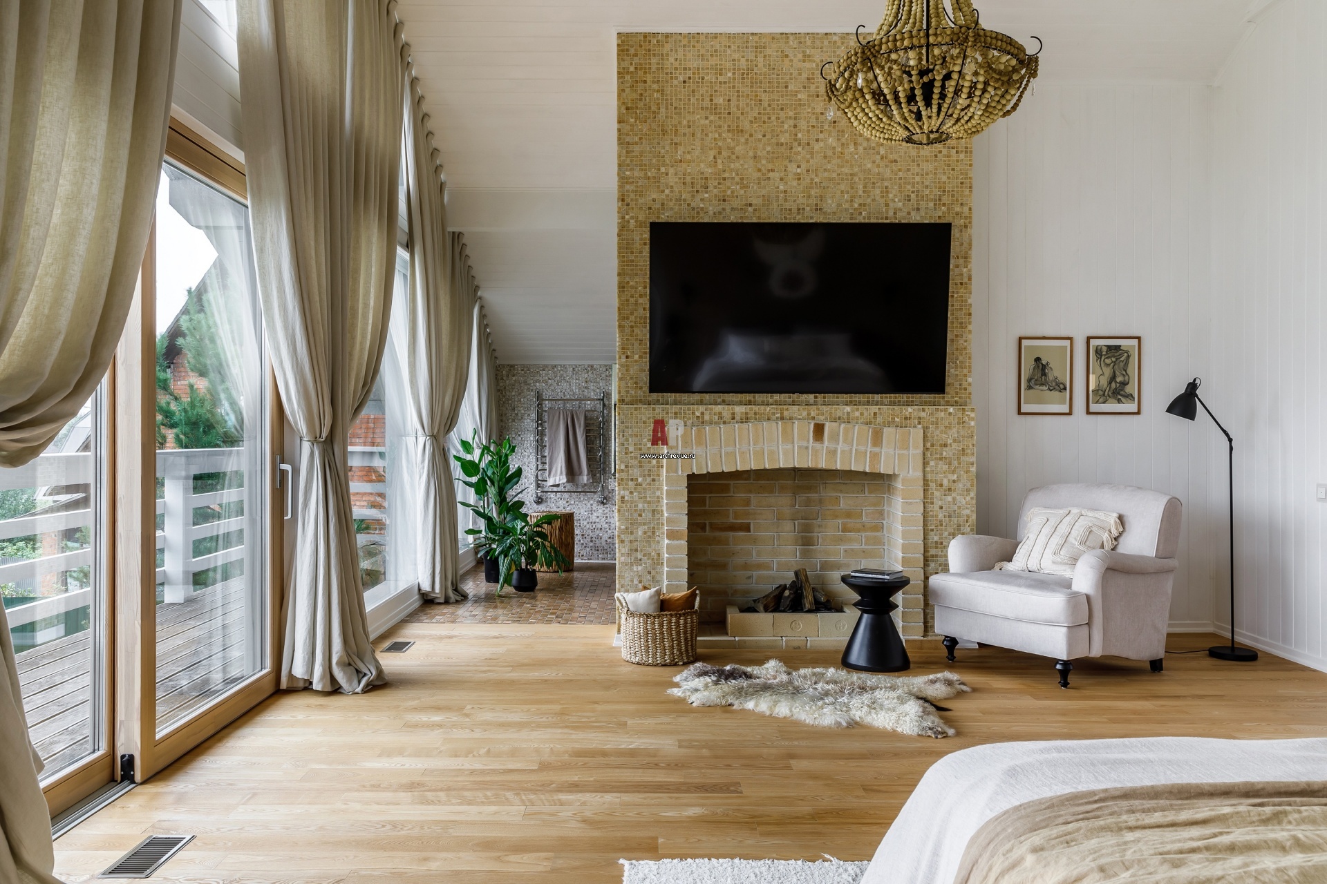 Спальня с зоной отдыха и камином. Огромная люстра выполнена из керамических бусин ручной работы.