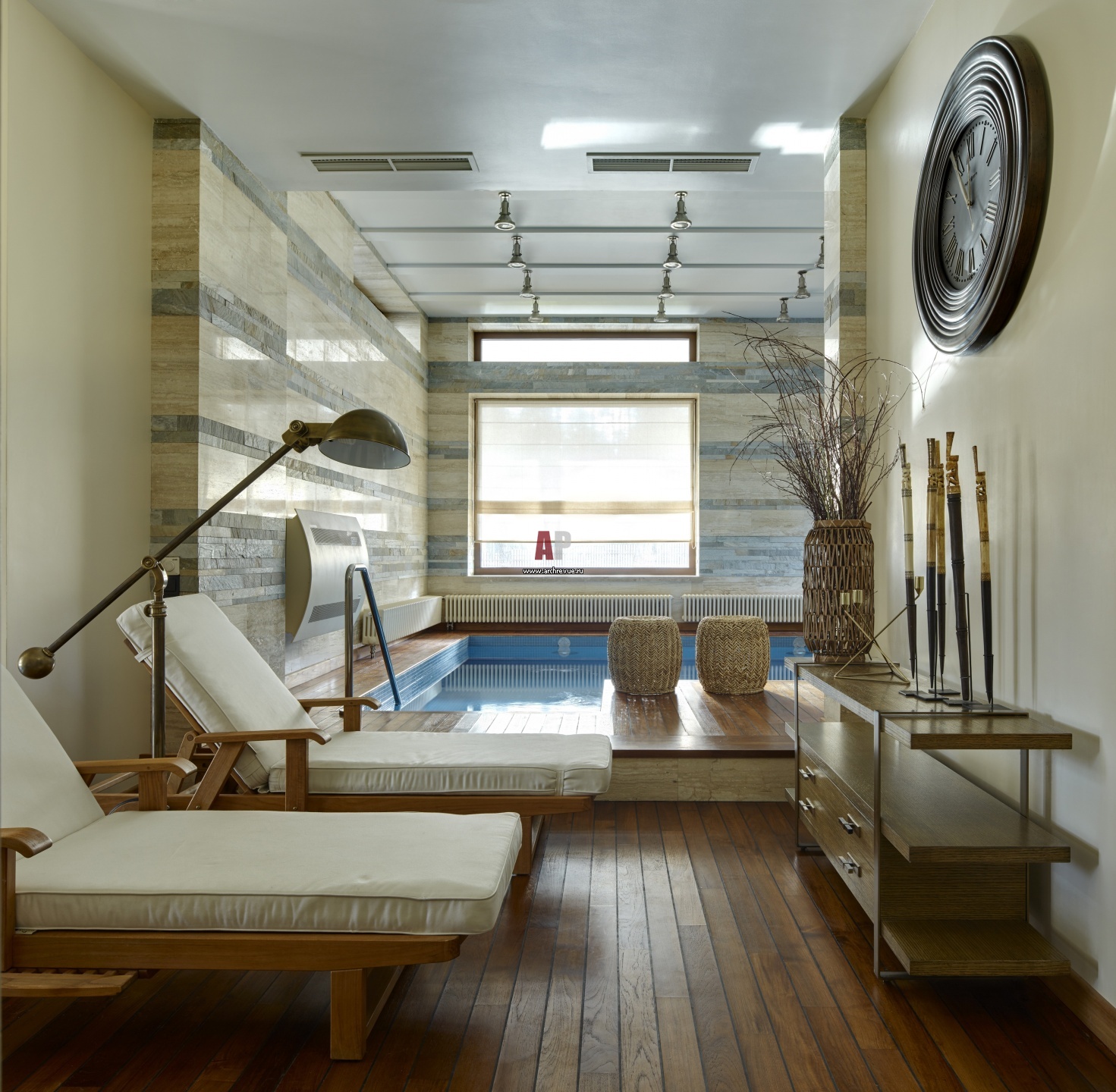 Стены в бассейне облицованы пиленым травертином со вставками из сланца. Плетеные пуфы Izzy, Crate and Barrel. Лежаки, Gloster.