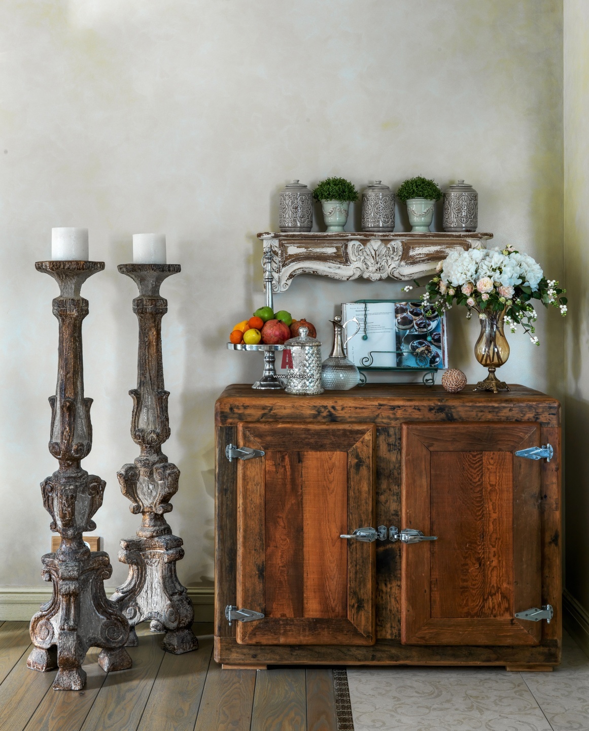 Эклектичный дом с патиной времени и состаренными фактурами. Дубовый комод с металлическими замками в столовой перекрасили и состарили.