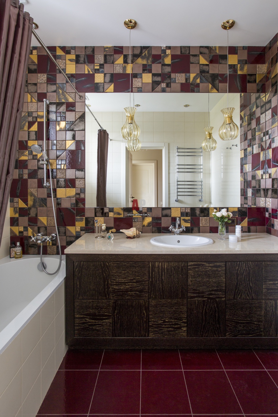В интерьере ванной комнаты привлекает мозаичная стена. Панно выполнено из крупных фрагментов керамической плитки разной формы ярких цветов: глубокого винного и золотых оттенков. Санфаянс, Flamina, Villeroy & Boch.