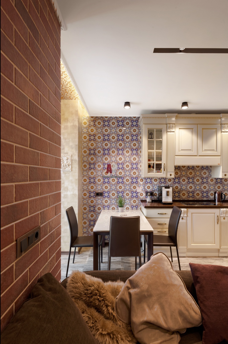 Дизайн общей кухни-гостиной. Кухонный фартук, стена за обеденным столом облицована керамической плиткой в этническом стиле.