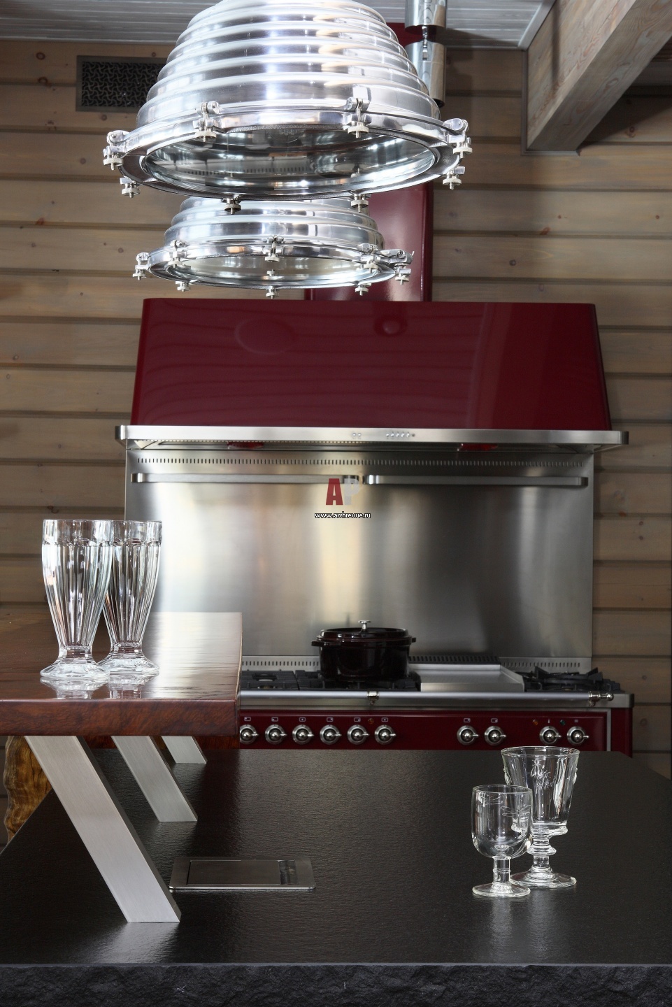 Кухонный остров с гранитной столешницей дополнен барной стойкой. Она выполнена на заказ из массива бубинги.