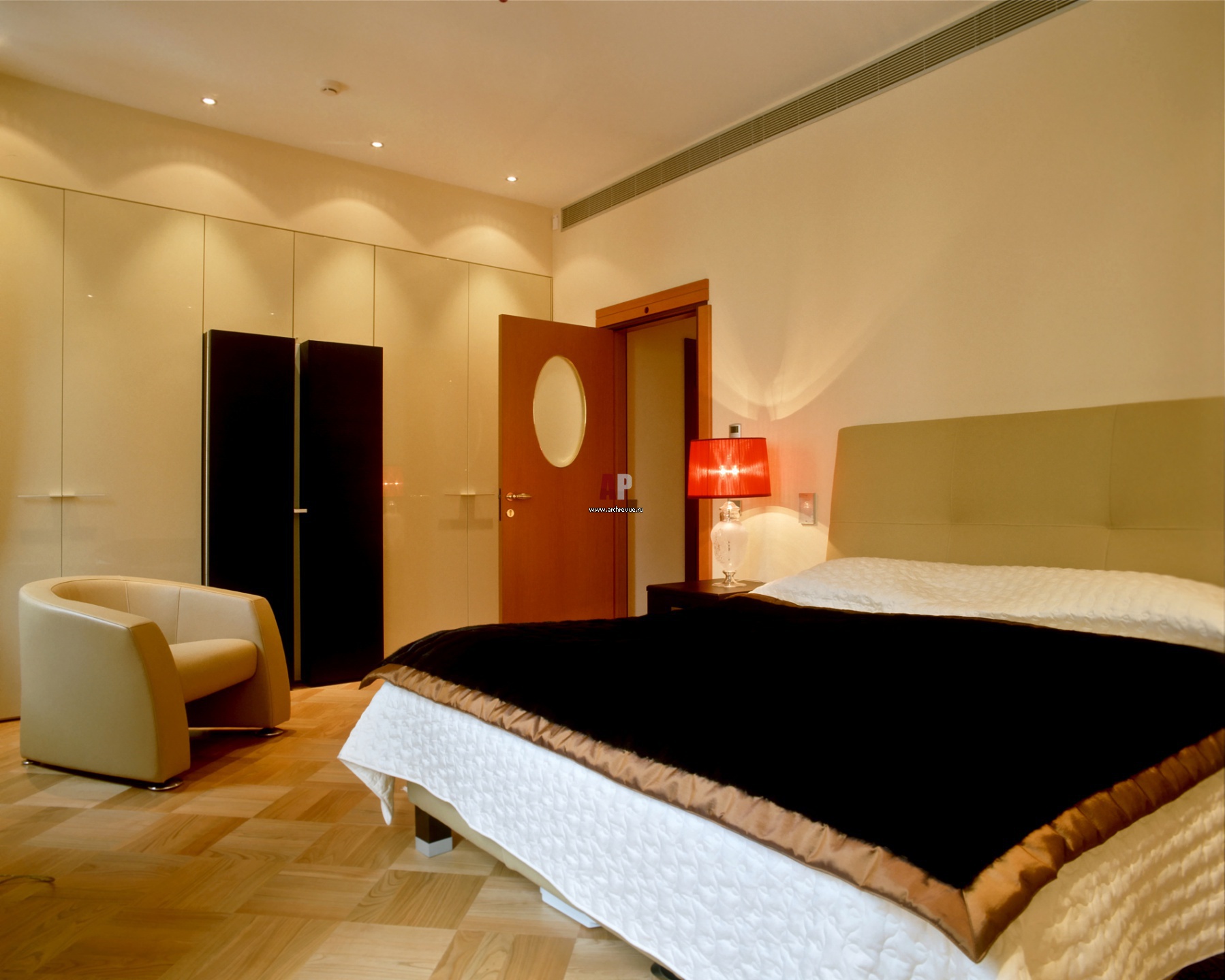 Хозяйская спальня в бежево-песочной цветовой гамме. Ковать Treca Interiors Paris (Франция) стилизована под ар-деко. Матовое дерево паркета, поставщик «Ковчег-паркет», контрастирует с лакированными поверхностями.