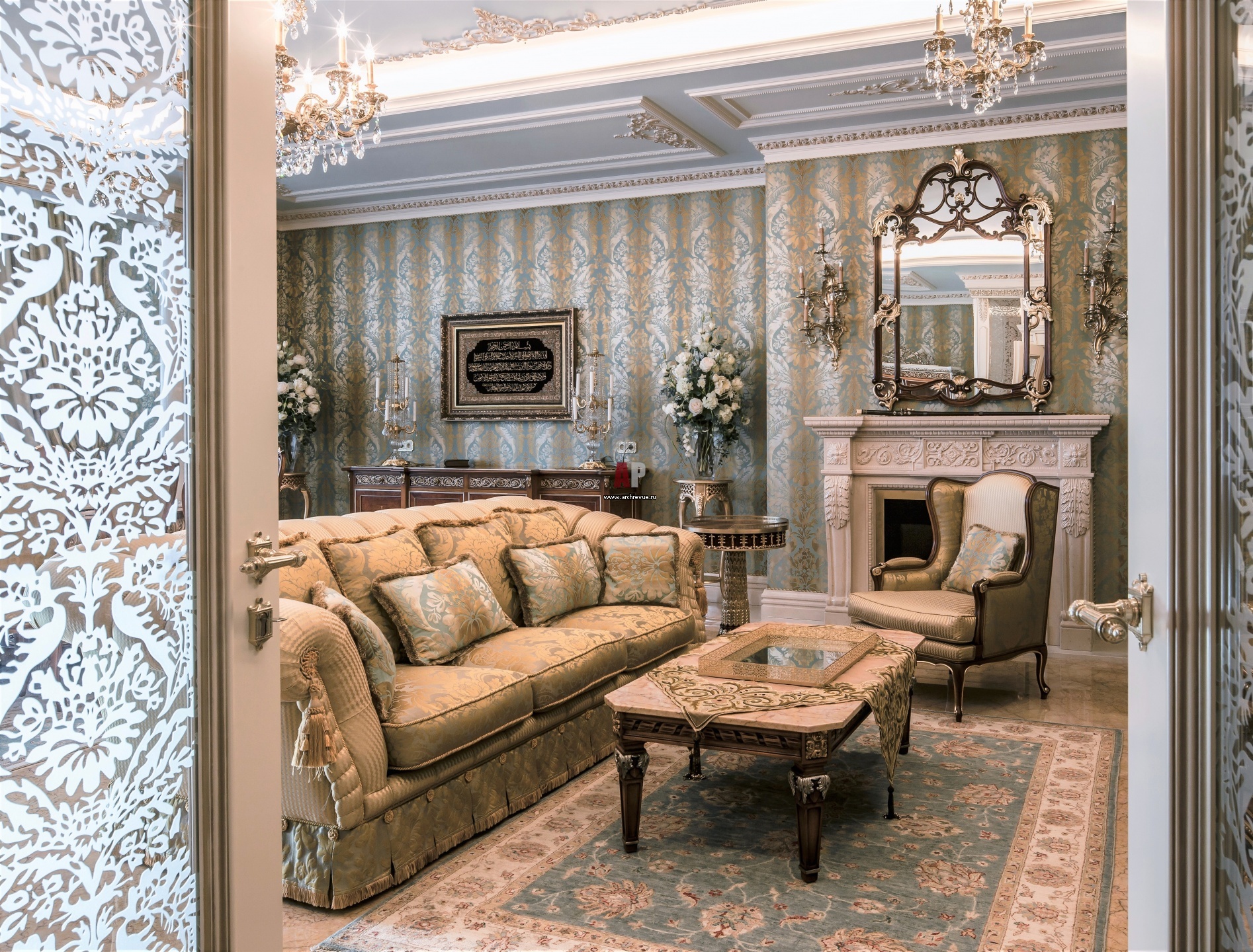 Вид из холла на гостиную. Прихотливый ажурный орнамент, выгравированный на прозрачном стекле, выглядит воздушно и облегчает пространство. Дамаски на стекле повторяют декор шелковой обивки стен благородного бирюзово-золотистого цвета.