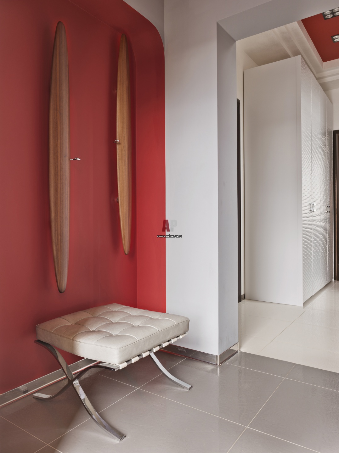 Интерьер прихожей в дизайне современного таунхауса. В отделке помещений первого этажа использован тонкий зеркальный плинтус.