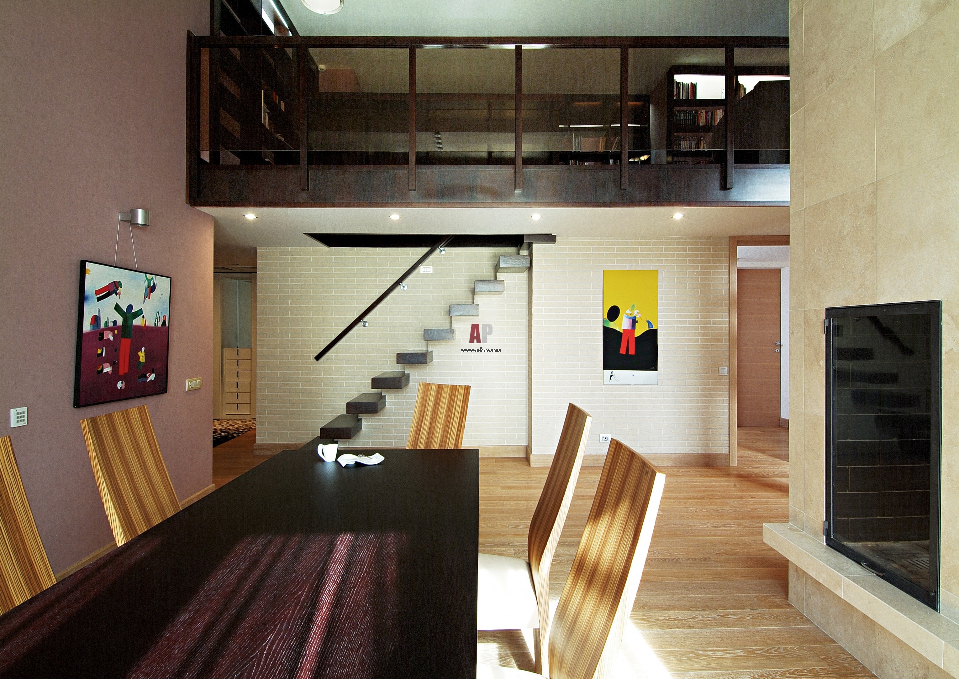 Студийная гостиная с надстроенной антресолью. Минималистская лестница на второй этаж примыкает к стене, без перил и ограждения она кажется парящей в пространстве. Стены отделаны облицованным кирпичом.